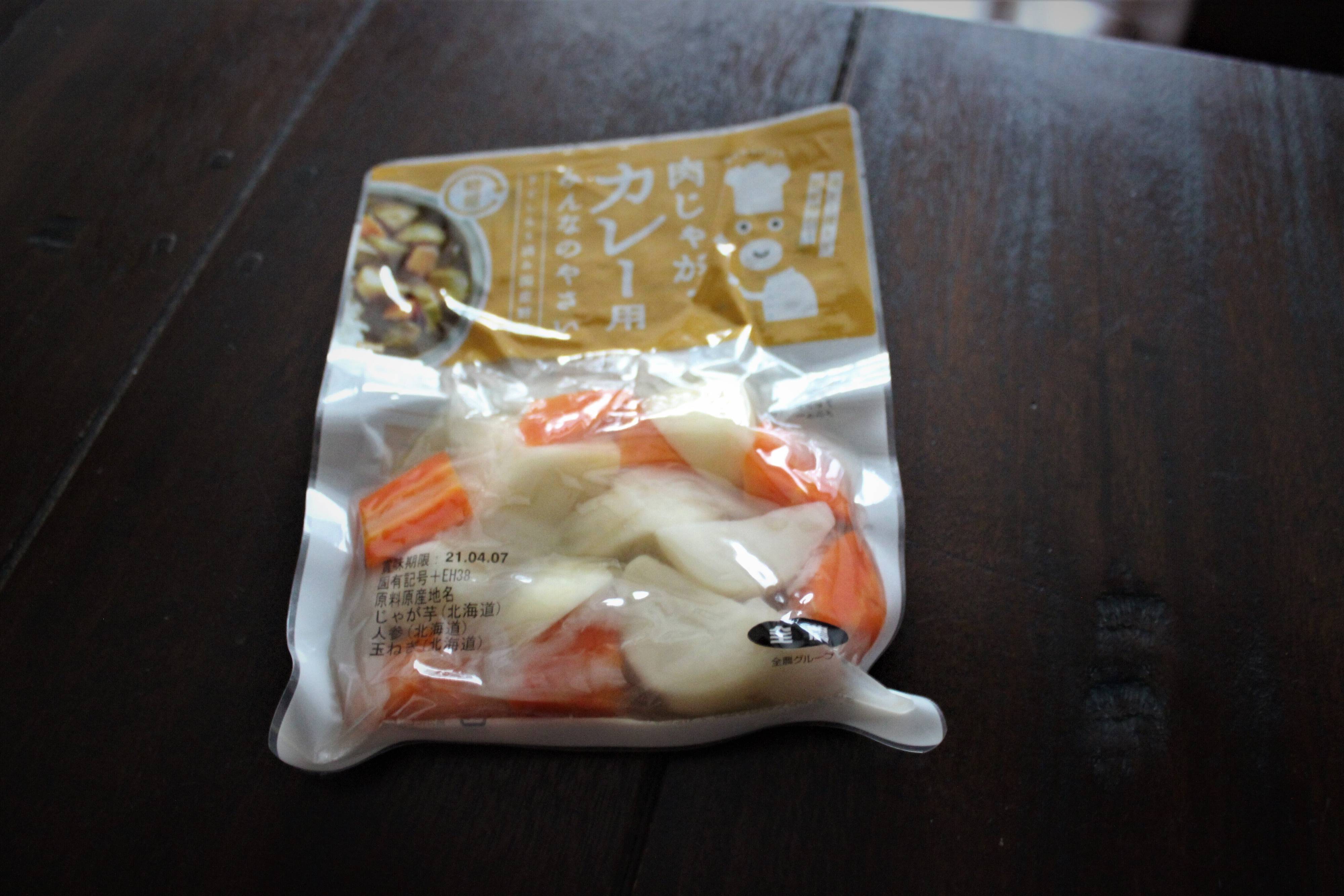 今回使ったのは、防災食として常備している全農「みんなのやさい 肉じゃが・カレー用」。