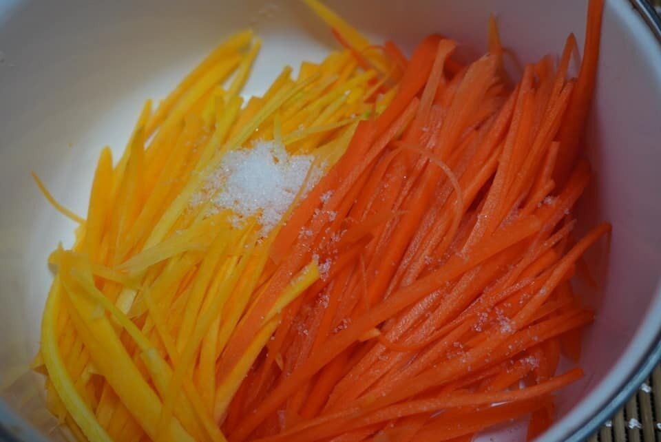 簡単に作り方を説明すると、まず人参を千切りにして軽く塩をします。