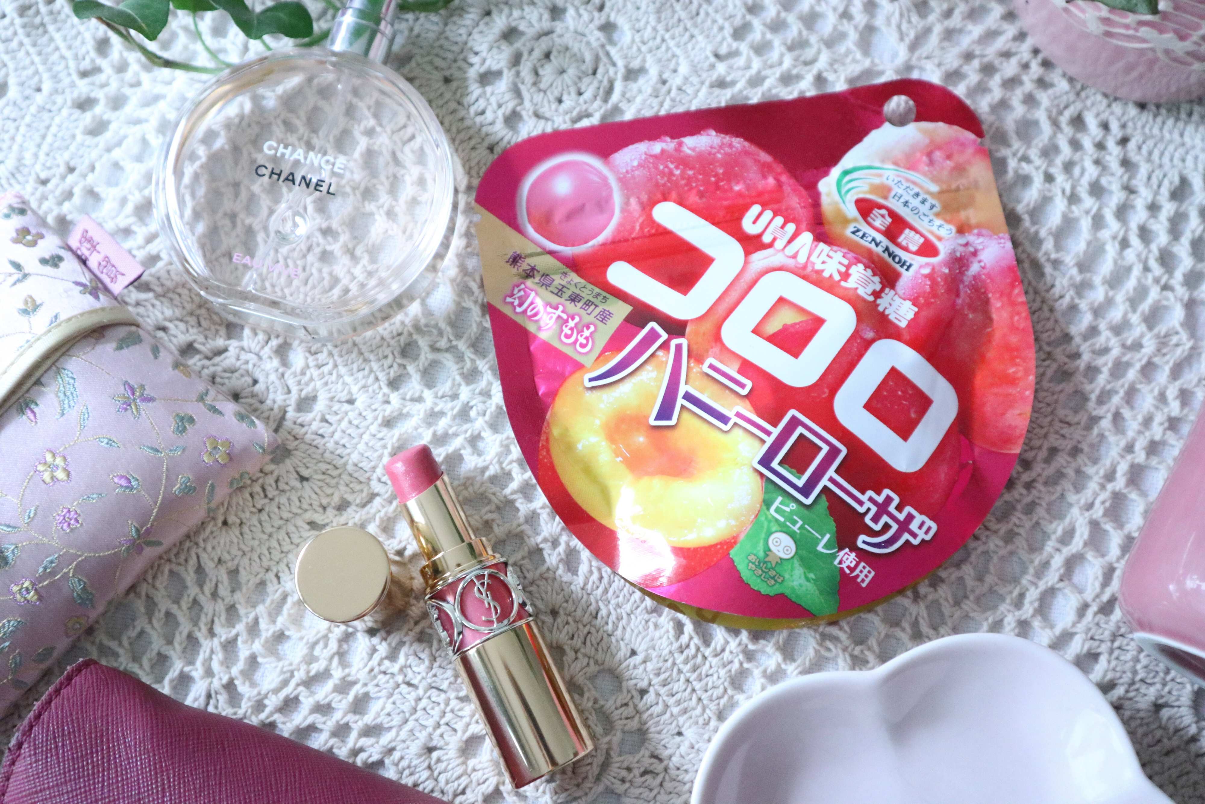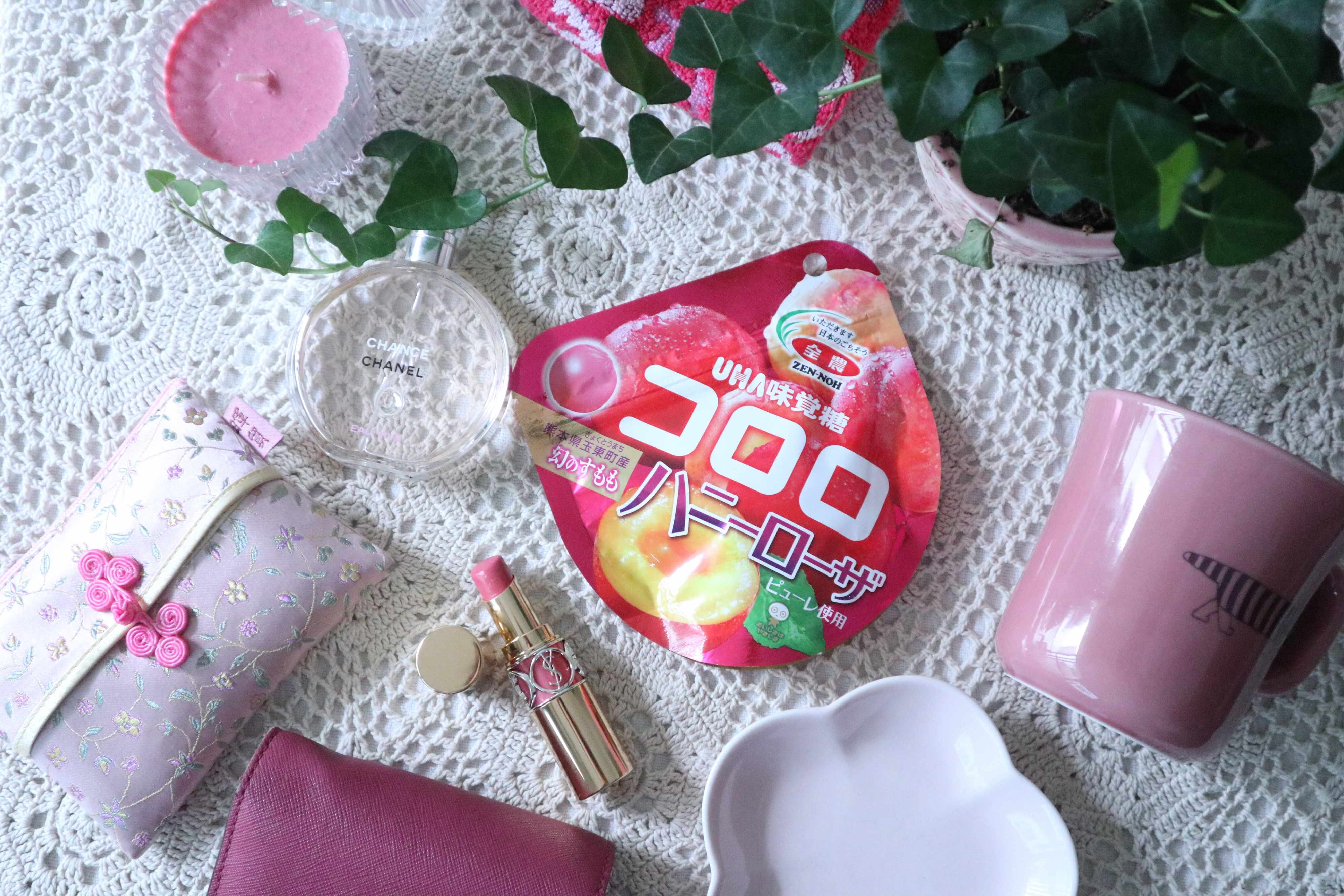 コロロハニーローザのピンクのパッケージに合わせて、私の周りのピンクを集めてみました。
