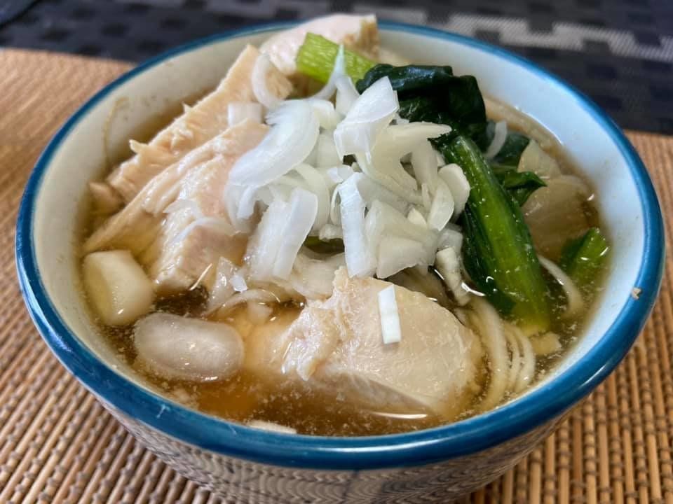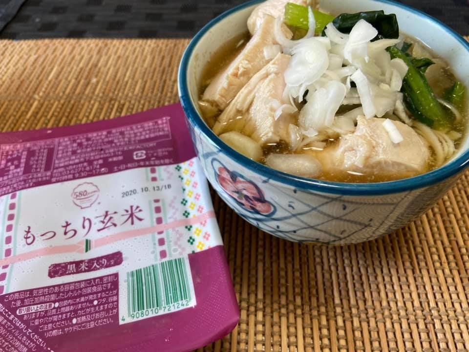 たっぷり野菜と鶏胸肉のスープにもっちり玄米の組み合わせでバランスを考えています。