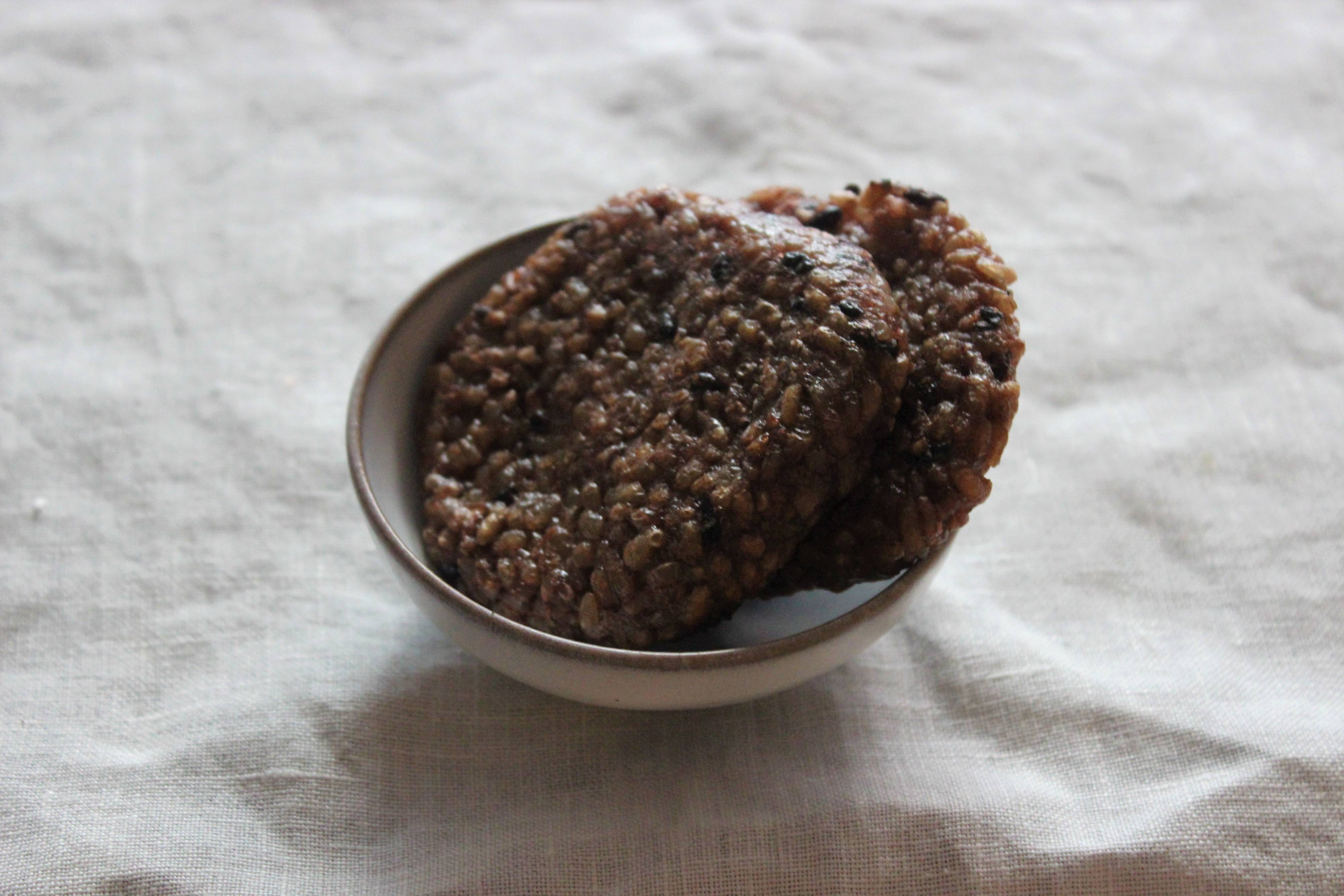 ちょいごはんで作ったおむすびは、平らにつぶしてお醤油を塗り、魚焼きグリルやフライパンで焼くと、外は香ばしく、中はもっちりとしたおせんべいになります。