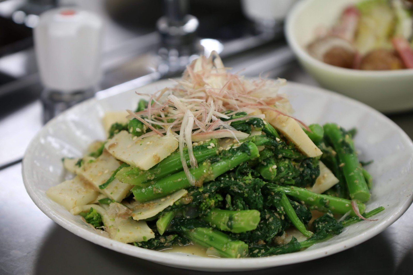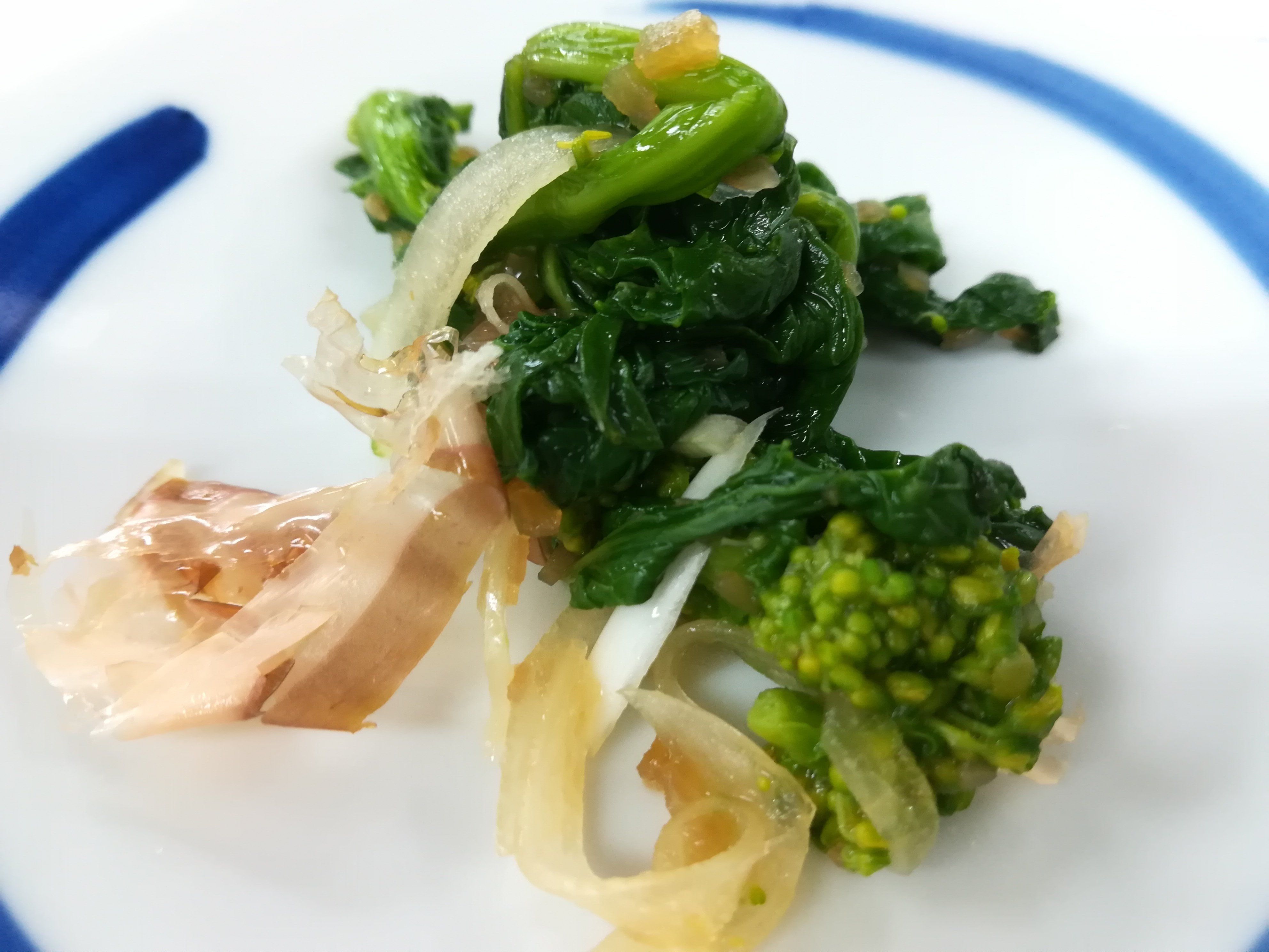 素材の組み合わせも、勉強になります!ミョウガやかつお節、玉ねぎ…菜の花の味や食感を引き立てるんですね。見栄えもよい!