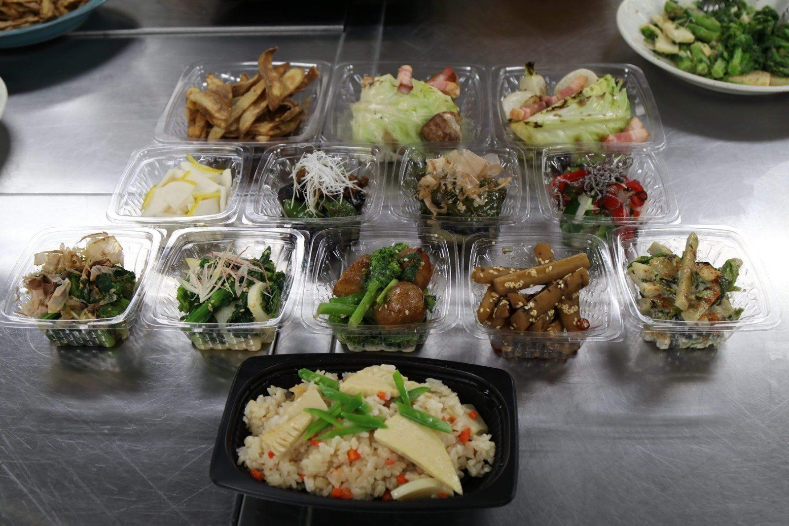 こんなカンジでパック詰めされて、お店で買えるようになります。お惣菜は一人から二人でつまむのにちょうどよいサイズ。品川という立地柄、お客様は仕事帰りの若い人やワーキングママ、またはお年を召した方が少量買っていく、ということが多いそう。