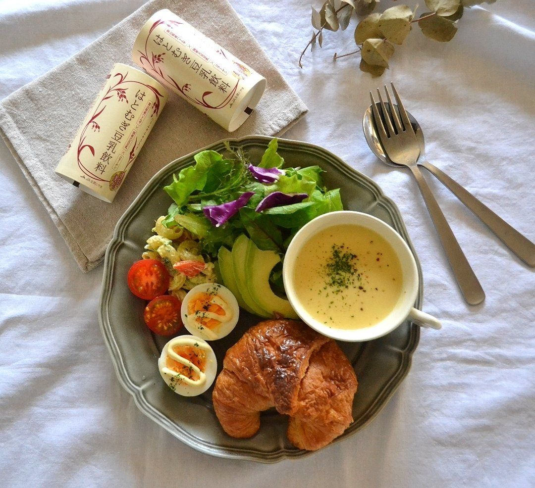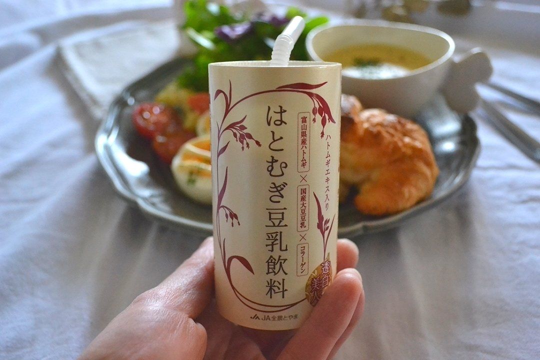 ワンプレート朝ごはんにプラスしている物が、富山県産「はとむぎ豆乳飲料」です!!