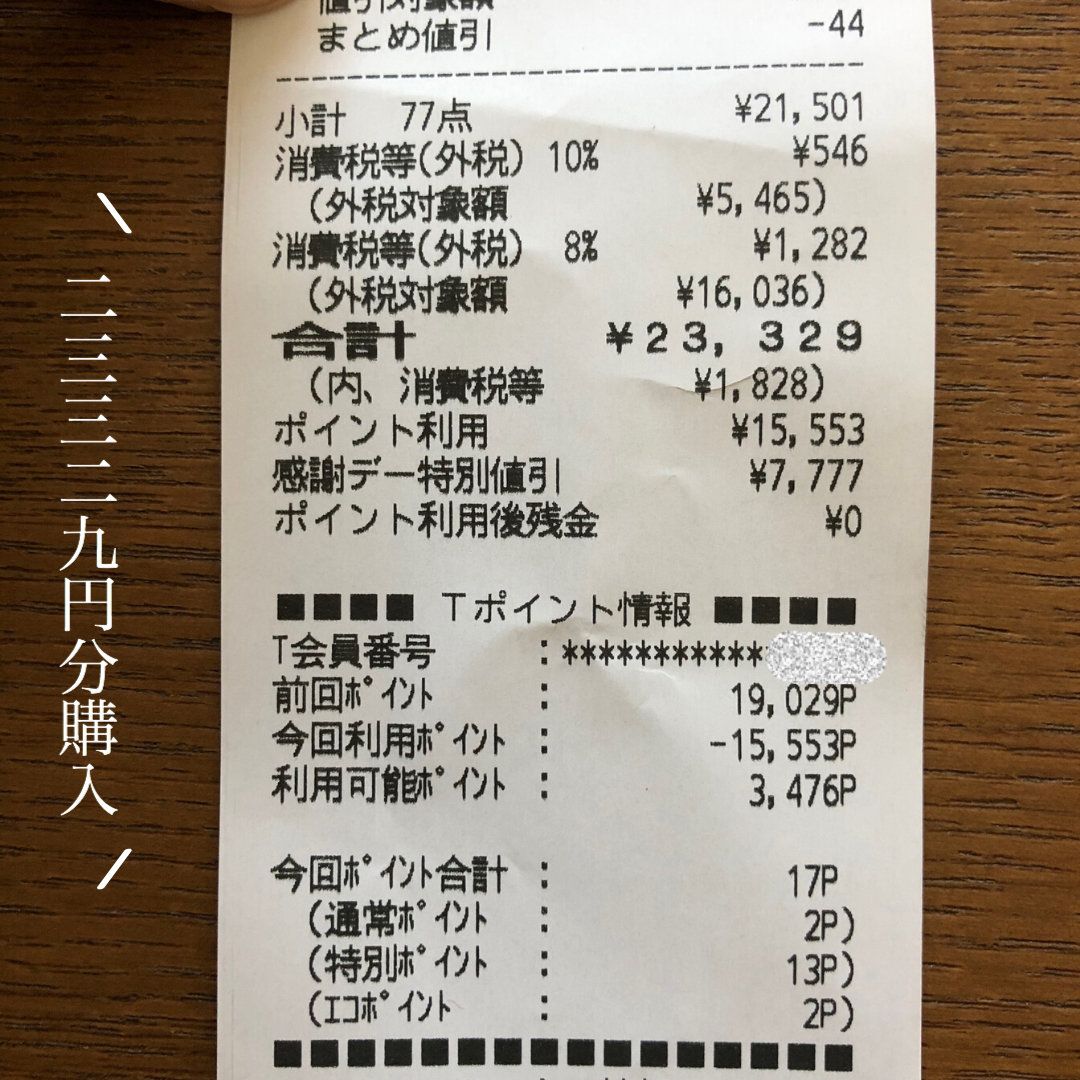 レシートを見ると分かると思いますが、23329円分がTポイントを使って支払いをするだけで33%引きの15553円になるのです。もっと言えば、Tポイントで支払うと7777円分割引きになっちゃうのです!