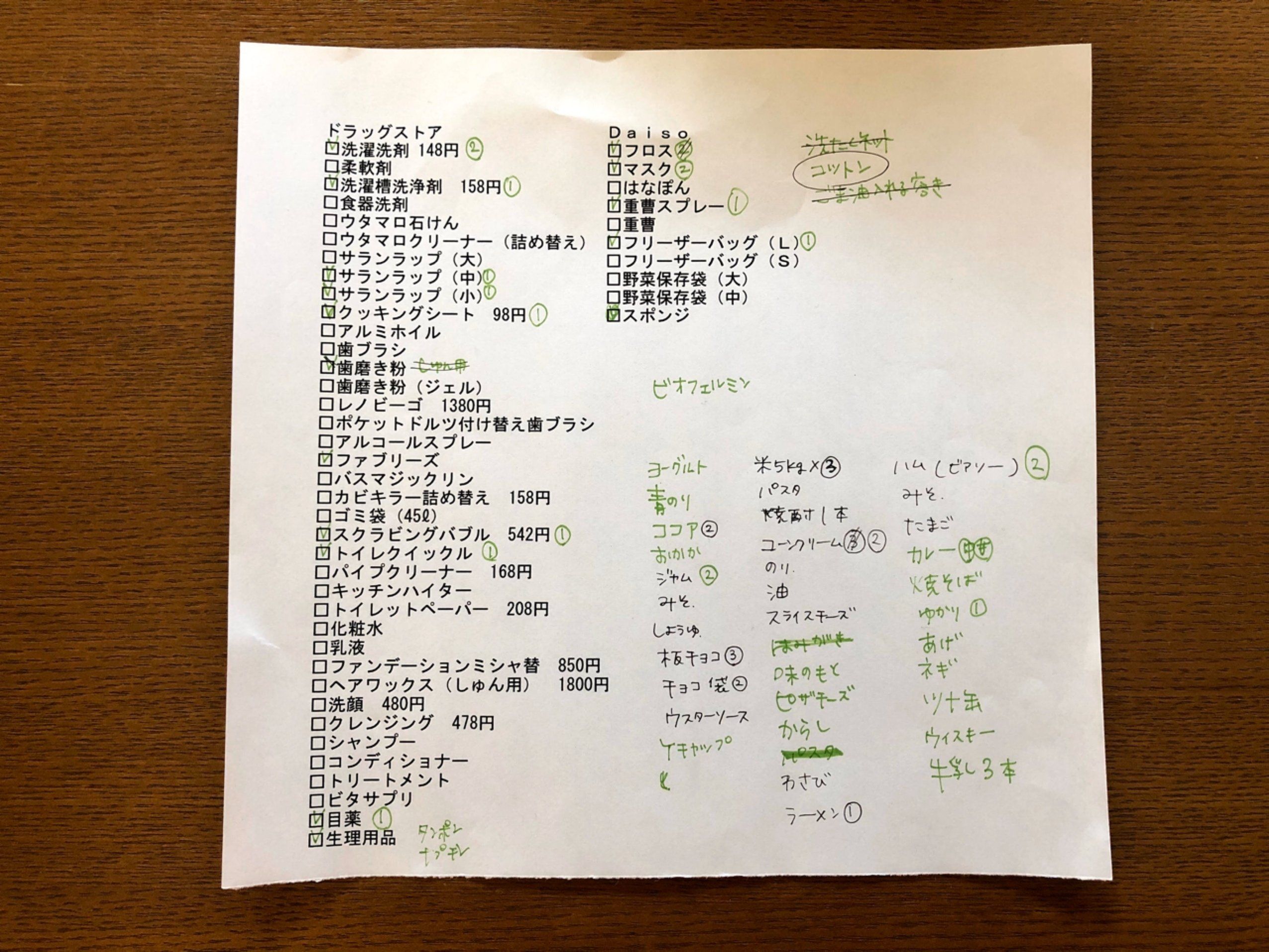 1か月かけて、日用品や調味料など無くなったものが出てきたらチェックしたり書き足したりします。ポイントで購入できるからと言って、不必要なものを買っていては節約にはなりません。お金を支払わなくても、必要なものしか買わないというのが私の節約方法。