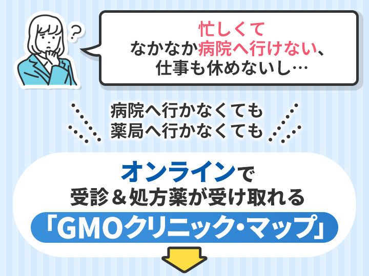 たとえば花粉症。花粉症で悩んでいる人は毎年、たいてい同じ病院で一度診察を受けてから、薬を処方してもらいますよね。でも、そのために病院に行かなくてはいけないのもつらい…。そんなときこそ「GMOクリニック・マップ」! 病院に行かなくても、オンラインで受診して、オンラインで薬を処方してもらえるんです。
