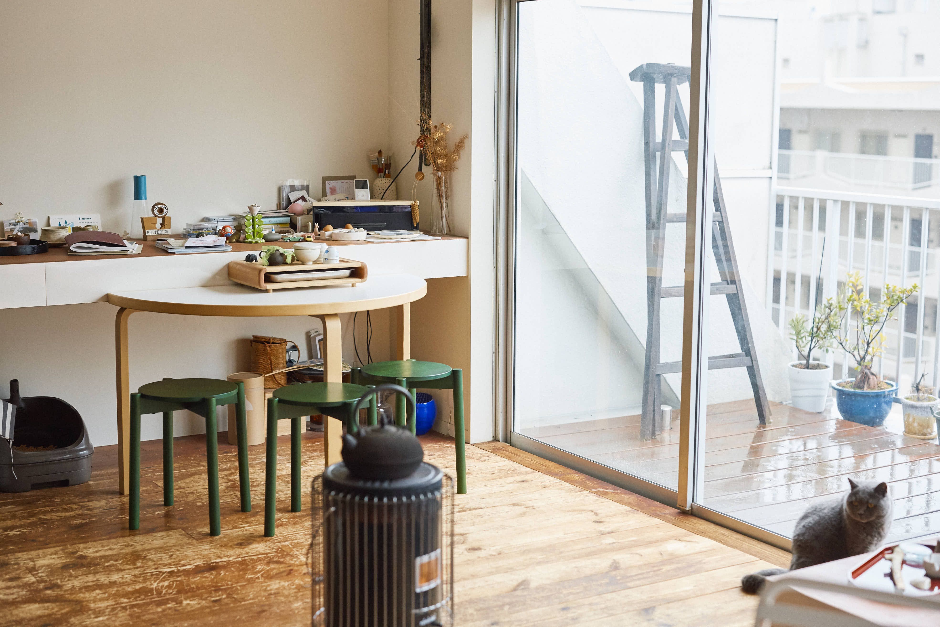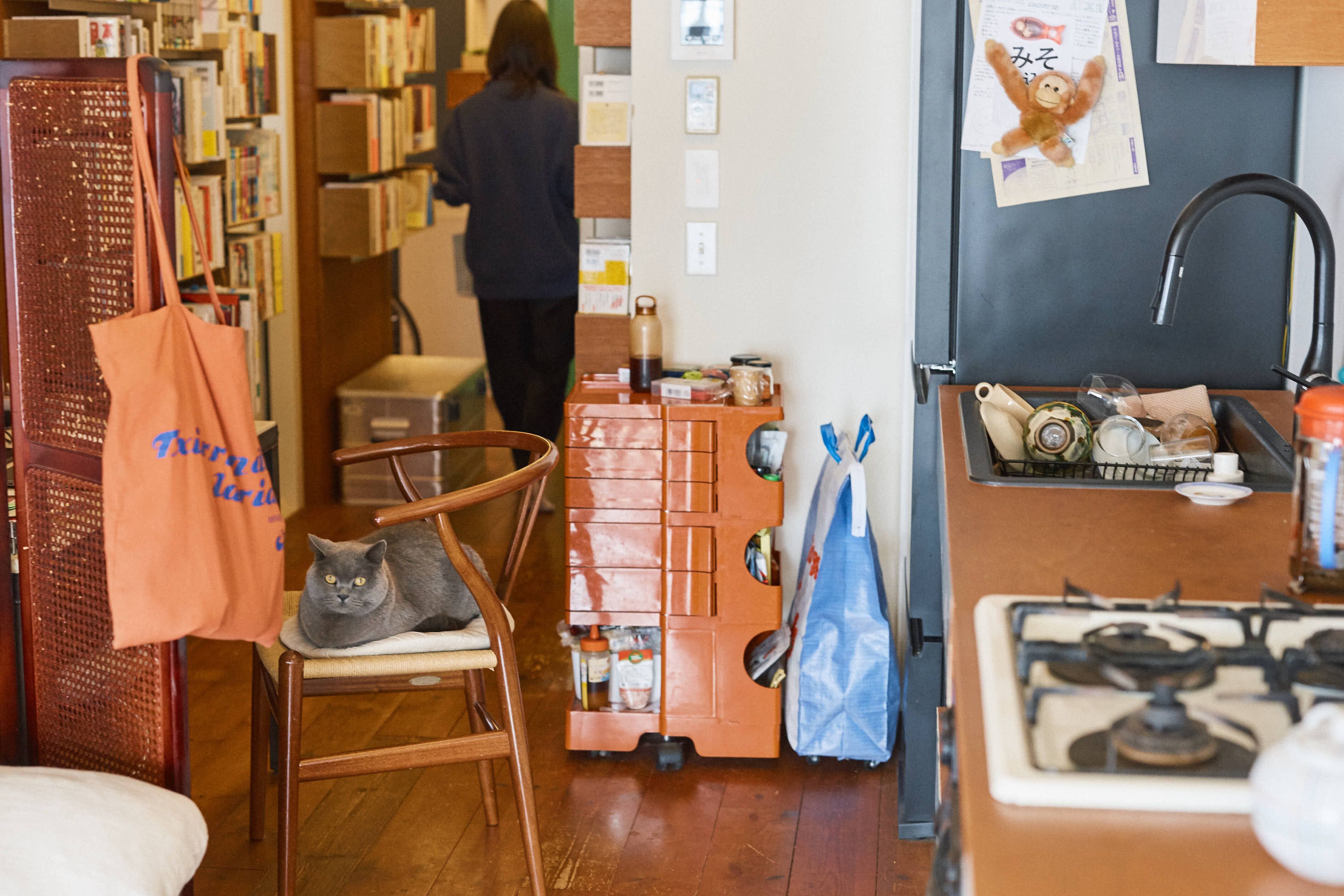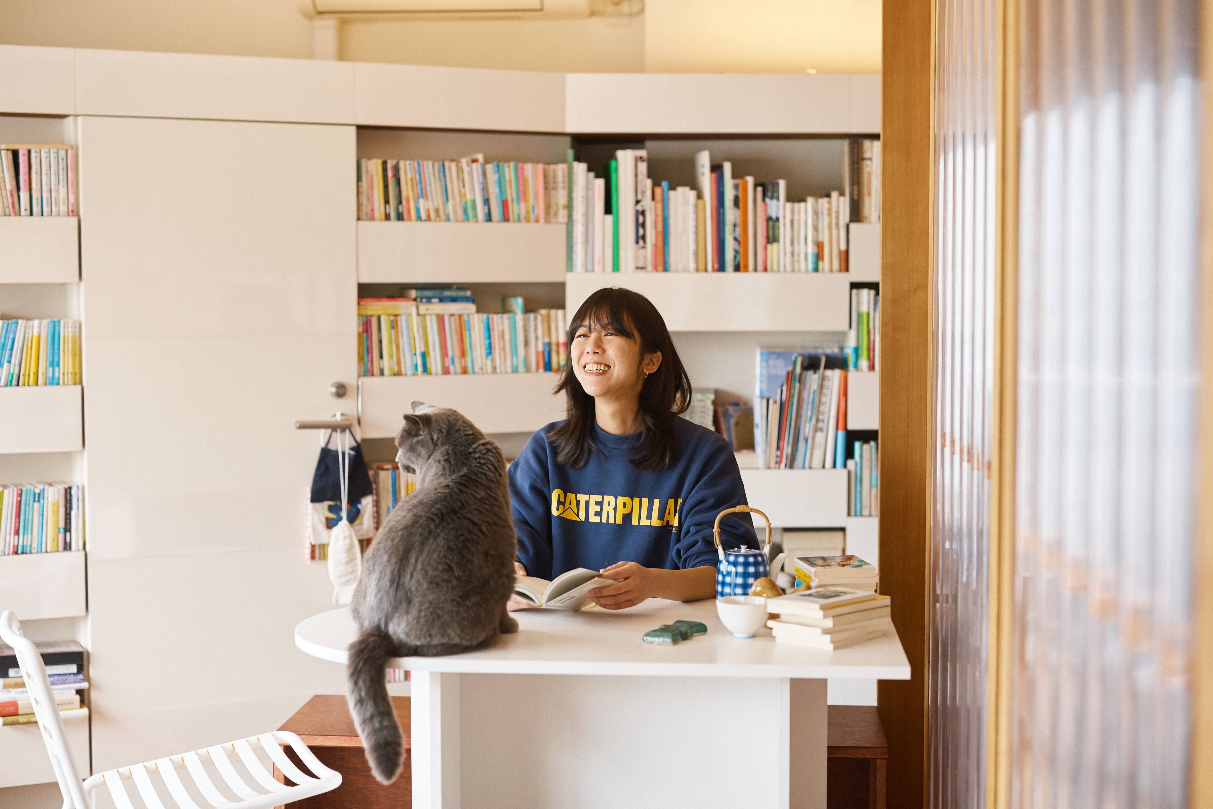 見晴らしのいい外廊下を歩いて部屋のチャイムを鳴らしてお邪魔します。図書館のように部屋の奥へと書棚が並び、書棚だけではなく床にも窓際にも本が積まれています。家主の真衣さんと一緒につやつやしたグレーの毛並の猫が出迎えてくれました。
