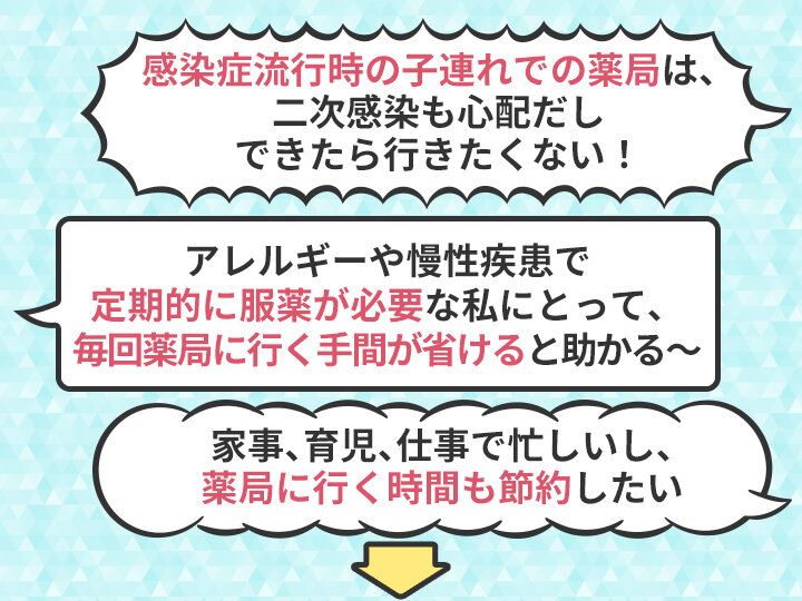 「処方薬デリバリーサービス」は、外出が不要になり、家事や育児、仕事などで毎日忙しい人も都合をつけやすいのがうれしいところ。また、本人が服薬指導を受けられない特別な事情がある場合は、本人の症状や服薬状況を説明でき、服薬指導の内容を伝えられる人であれば、本人ではなくても家族が代わりに服薬指導を受けられます。