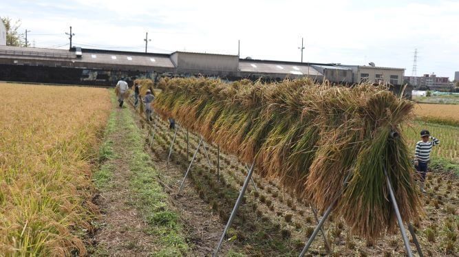 刈って束ねた稲をはざかけして乾燥させます。その後脱穀して精米してようやく食べれるようになるのです。