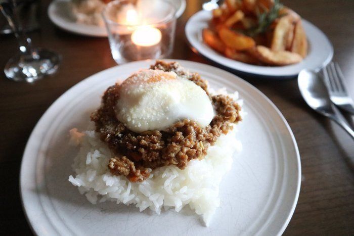キーマカレーの上にとろとろの半熟卵をのせて。