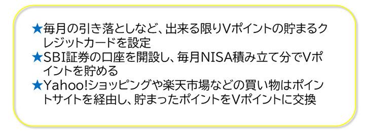 貯めたポイントは、証券投資積み立てに。VポイントのままSBI証券を使うのがおすすめ。一度設定してしまえば、あとはほうっておいてもいいので楽です。さらに積み立て投資分でポイントも貯まってうれしいです。