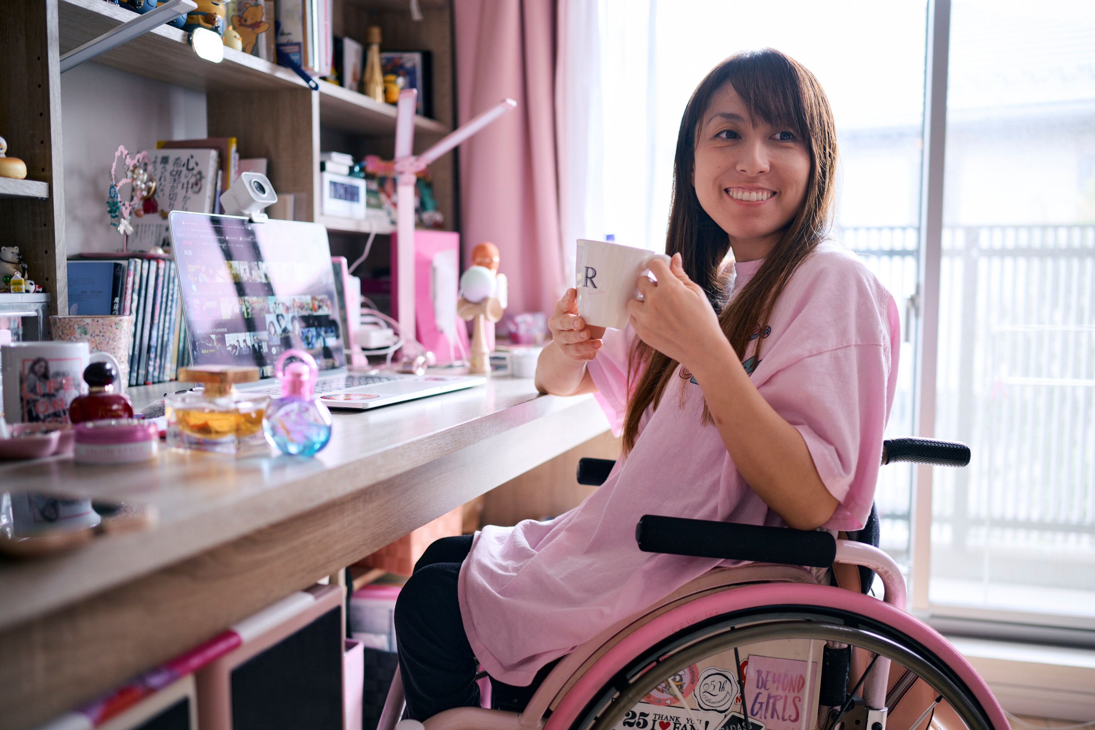 1986年東京生まれ。38歳。原因不明の病気で9歳から車椅子ユーザーに。高校卒業後、アメリカに留学。帰国後、通訳や会社員を経て、31歳から車椅子インフルエンサーの活動をスタート。
