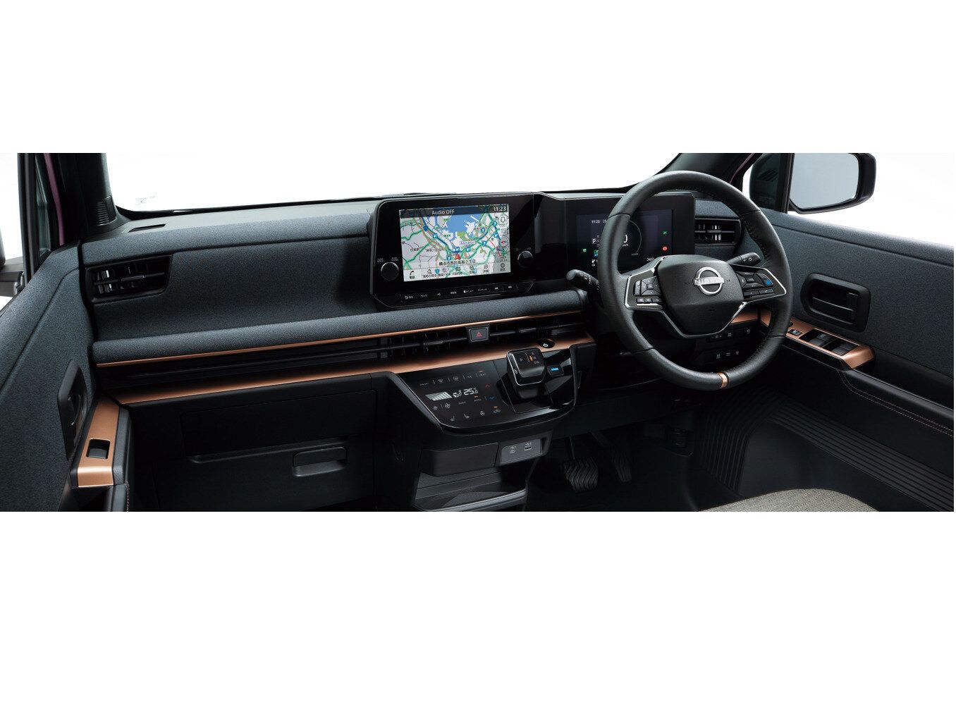 内装は、モダンで洗練された雰囲気。ハンドルやダッシュボードには上質感のある素材が使われており、見た目にも手触りにもなめらかさが際立っています。