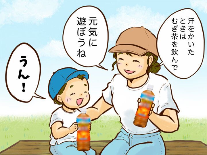 日常生活や適度な運動時の水分補給には、水かむぎ茶がおすすめ。たくさん汗をかく外遊びの前後、運動中、入浴前後のほか、就寝前や就寝後、食事のときにもむぎ茶で水分補給しましょう。