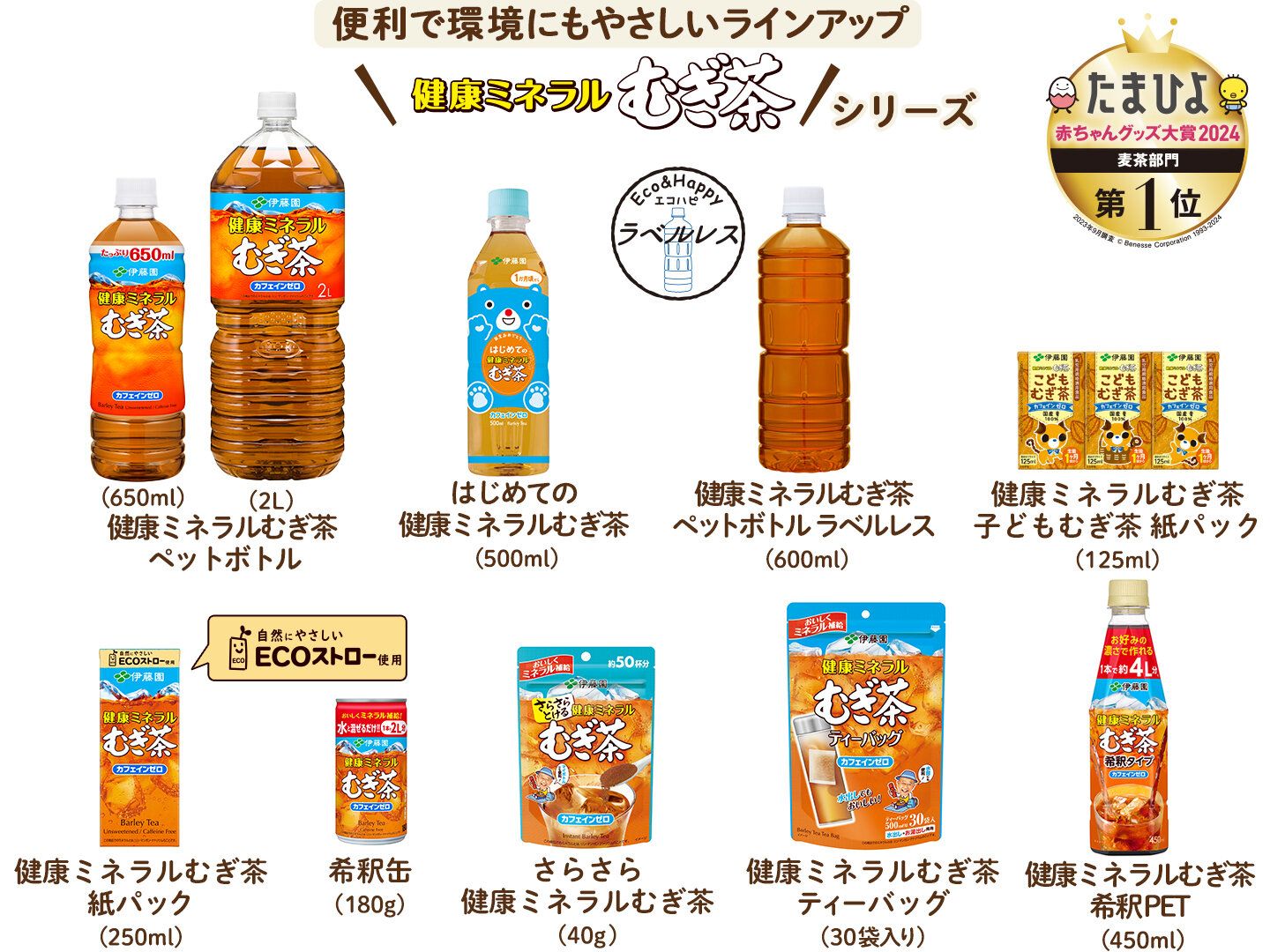 伊藤園の「健康ミネラルむぎ茶」が水分補給におすすめなのは、無糖でカフェインゼロ、カロリーゼロだから! さらに、乳児用規格適用食品と同等の管理をしているから多くのママに支持されて、「たまひよ赤ちゃんグッズ大賞」2024年麦茶部門で第1位を獲得。実は部門創設以来9年間、連続1位に輝いています。だから、家族みんなで安心して毎日ゴクゴク飲めるんです。