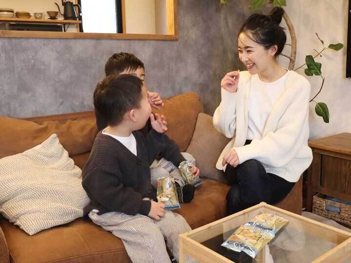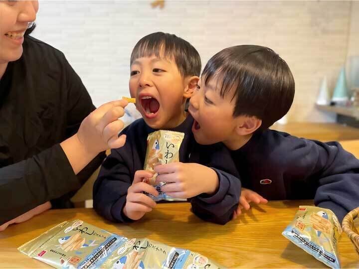おやつはなるべく素材にこだわりたいと思いつつ、スーパーなどのお菓子が多くなってしまいがち。この「素材市場いわしのスナック」は、袋を開けるとふわっと魚のいい香り! スナック感覚なのに魚の栄養もたっぷり摂れて、罪悪感なくあげられるのがうれしいです。魚が大好きな2人は、そろって「おいしい!」と絶賛! 小さめのサイズなので、食べすぎる心配もないのがいいですね。