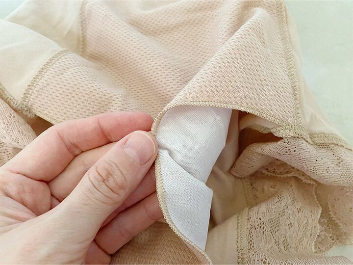 使用する生地は肌に刺激を与えないように、オーガニックコットン(※3)を93%使用。極細の糸を使い密度の高い編み方によって、コットンの“ザラっとした”感じではなく、肌当りが優しくなめらかになる加工がされています。ウエスト部分には、生地を折り返してゴムが直接肌に当たらない工夫も。締めつけ感がなく、食い込みにくくかゆくなりにくいから、履き心地がとてもいいんです。