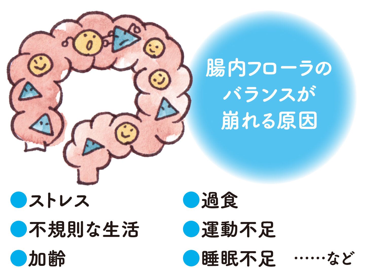 腸内に生息している多種多様な細菌の集合体のこと。腸内には善玉菌、悪玉菌などさまざまな菌がバランスを取って存在しています。乳酸菌やビフィズス菌は善玉菌の代表格なんです。腸内フローラはおなかの調子、肌荒れ、太りやすさなどと関係していて、腸内フローラを善玉菌優位で健康な状態に保つことが、全身の健康にもつながると考えられています