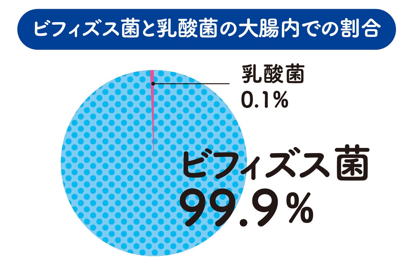 働く場所の違いの一つは酸素があるかないか。乳酸菌は酸素があっても活動でき、酸素が届く小腸で主に働きます。ビフィズス菌は酸素に弱いため、酸素がほぼない大腸で主に働きます。実は、大腸でのビフィズス菌と乳酸菌(*)の比率は99.9%:0.1%。大腸では圧倒的にビフィズス菌が多いんです