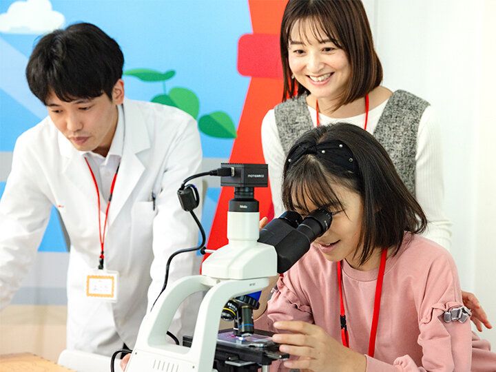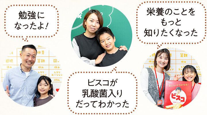 実はビスコのクリームの中にも乳酸菌が入っているんです。ということで、ビスコに含まれている乳酸菌がどのように腸に届くのかを教えてもらったり、実際に観察してみたり。顕微鏡で初めて見る乳酸菌にワクワク!