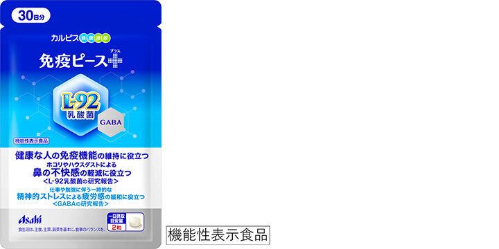 「免疫ピース+」は乳酸菌飲料カルピス® 由来の長年の乳酸菌研究から発見された「Ⅼ-92乳酸菌」と、注目の成分GABAを配合。3つの機能で快適な毎日をサポートします。