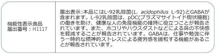 機能性関与成分:L-92乳酸菌:200億個、GABA:28mg