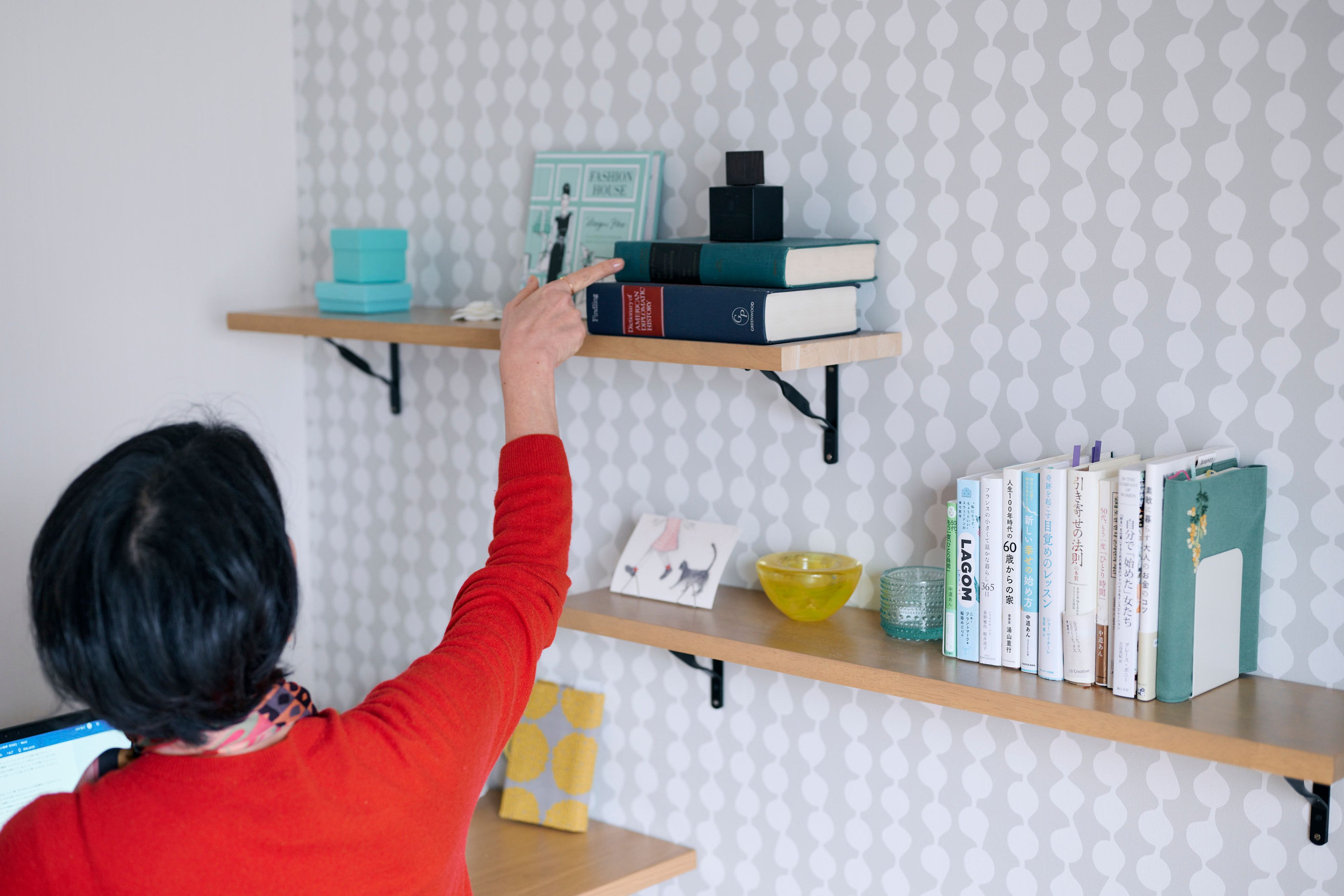 この棚は、オンラインでコンサルティングの仕事をしているときの”映え”も意識して、飾って見せることを前提につくり付けたもの。好きな本や自分の著作を並べたり、小物を飾って演出しています」。