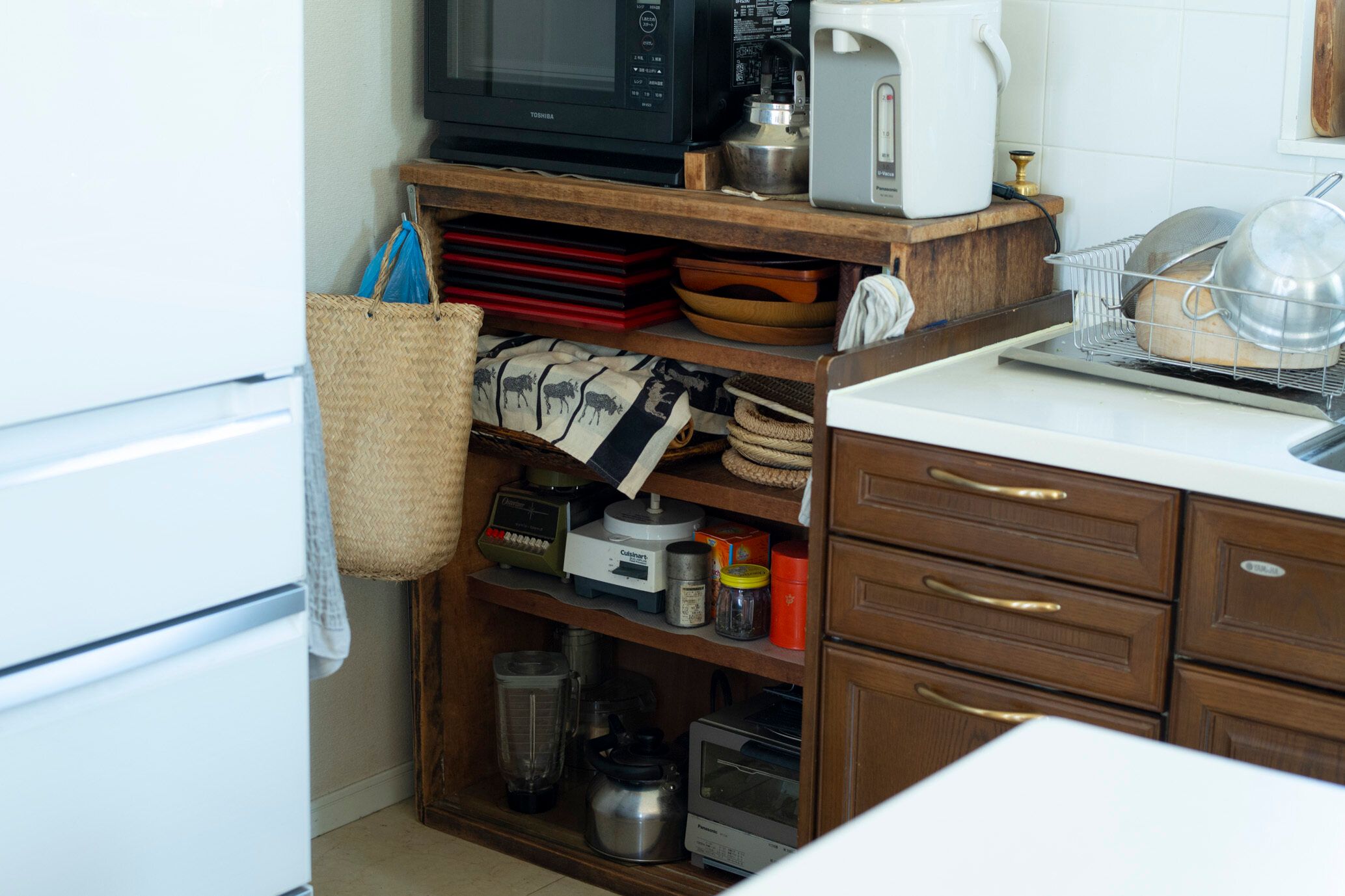 キッチン横の棚は、棚に入らないトレーややかんの収納に。まさるさんの趣味でもあるコーヒー豆もこの棚(3段目)に。撮影の合い間に振舞われる、まさるさん特製コーヒーが大人気。