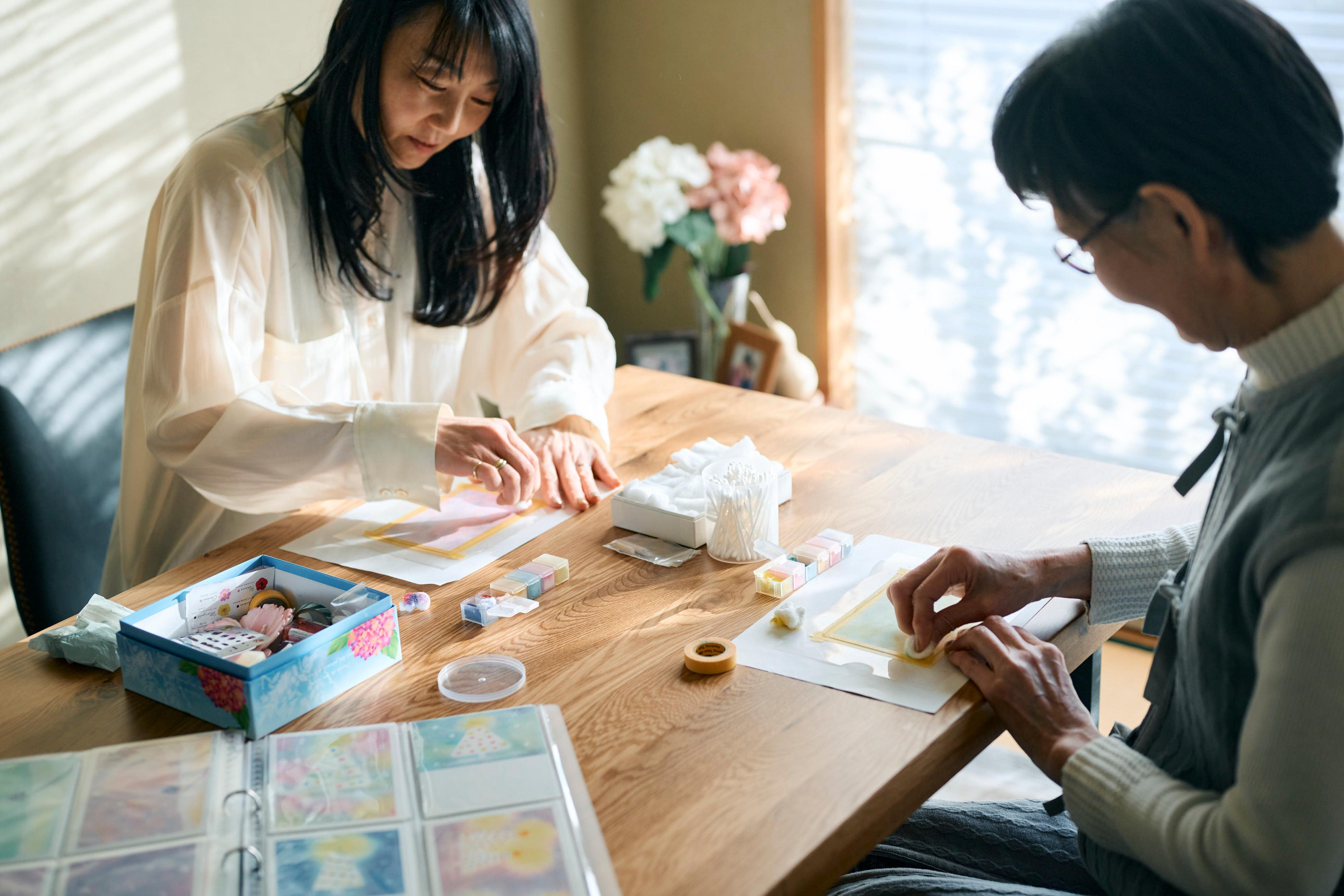 「50代、60代となっていくと、どんどん外に出るのも億劫になりがちです。美味しいものを食べる会とか音楽を聞く会とか、こういうカラーセラピーやアートセラピーの会など、なんでもいいから女同士で集まって仲間づくりをしていきたいと思っています」。そんな若松さんの思いが、部屋にも表れていました。