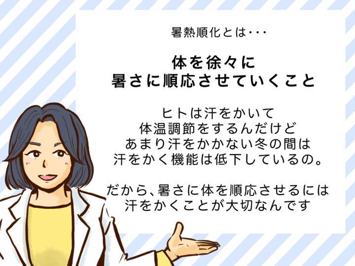 「暑熱順化(しょねつじゅんか)」とは、体が暑さに慣れること。暑さに負けない体をつくるためには、この「暑熱順化」がとっても重要なんです。暑熱順化の獲得に必要なのは、汗をかくこと。汗をかくことで、熱を発散して体温調節をする汗腺機能が高まり、暑さに対応できるようになります。