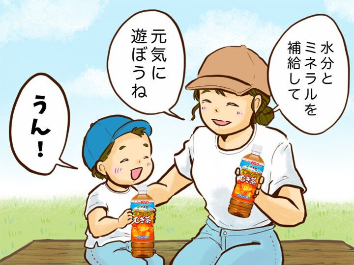 日常生活や適度な運動時の水分補給には、水かミネラル入りむぎ茶がおすすめ。たくさん汗をかく外遊びの前後、運動中、入浴前後のほか、就寝前や就寝後、食事のときにもミネラル入りむぎ茶で水分補給しましょう。