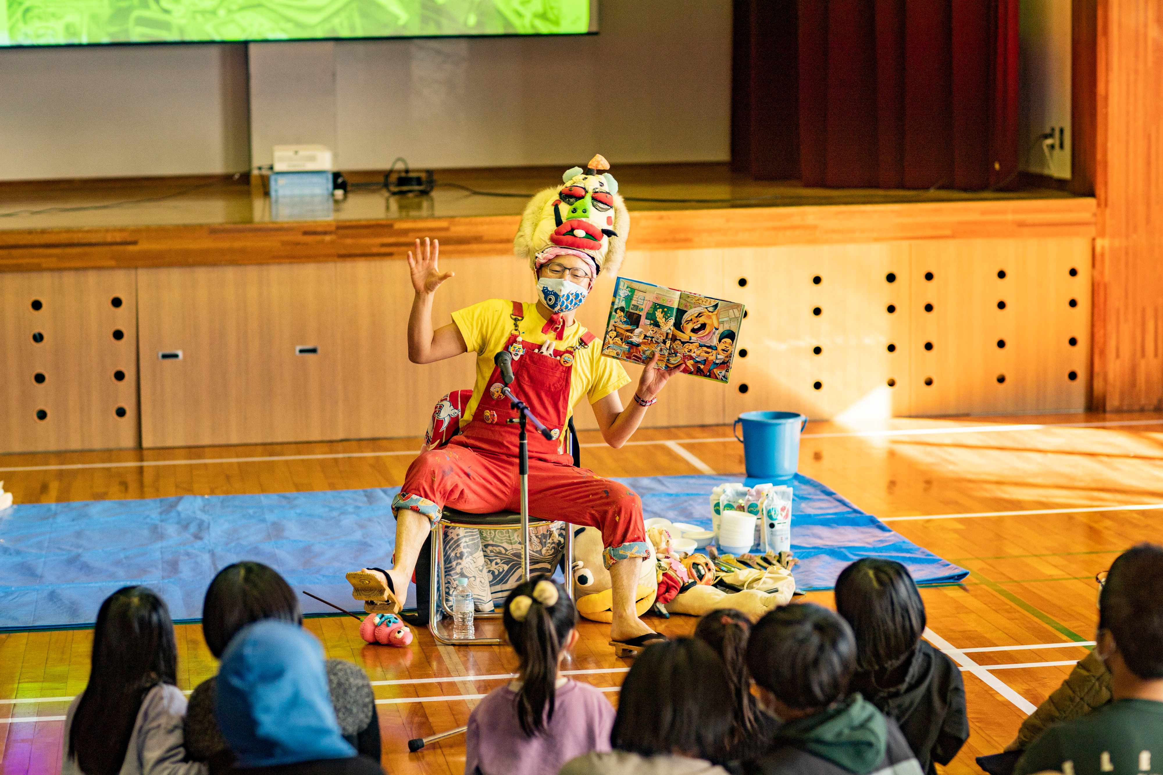 イベントのハイライトはライブペインティング。子どもたちが描いた絵をベースに、リクエストされたパーツや生き物をこうたくさんが描き足し、新しい生命体を生み出します。古今亭志ん朝らの落語を聴き倒して磨いた話術で場を盛り上げながら絵筆を動かす一方、会場じゅうの子どもたちを隅々まで観察。取り残されている様子の子がいたら、すかさず話しかけます