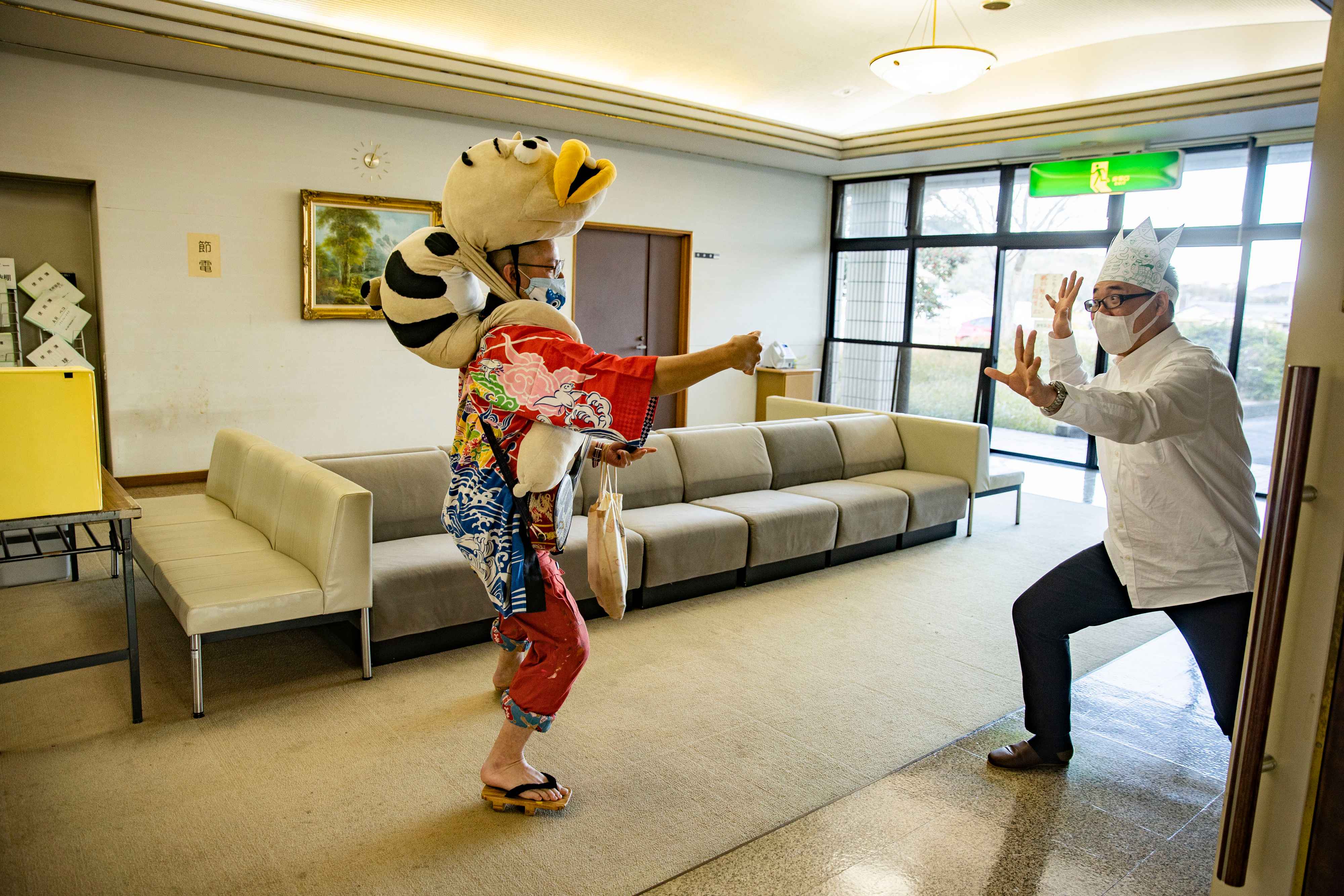 ハッピを羽織り、三線を弾きながら入場する。右はイベントを主宰した綾川町立図書館の横山正幸館長。頭にかぶっているのはこうたくさんのいちばん新しい絵本「交通安全大王」の付録の王冠