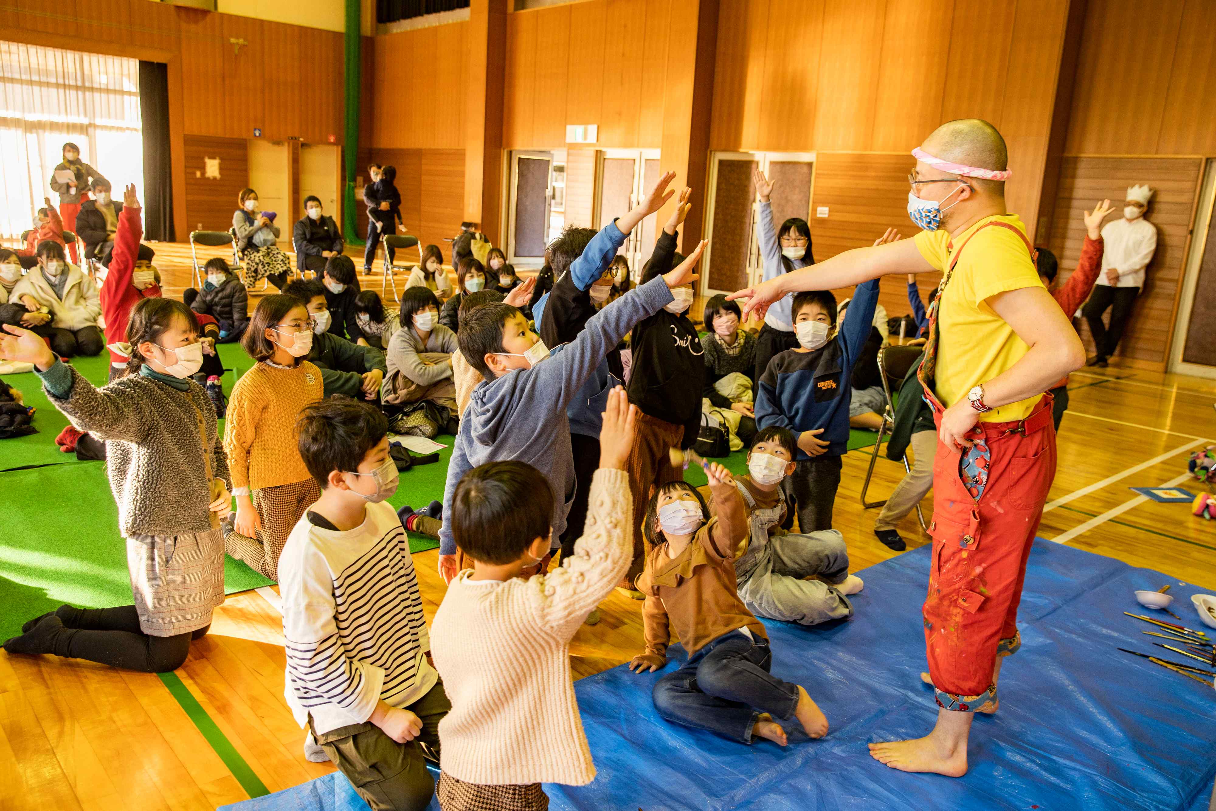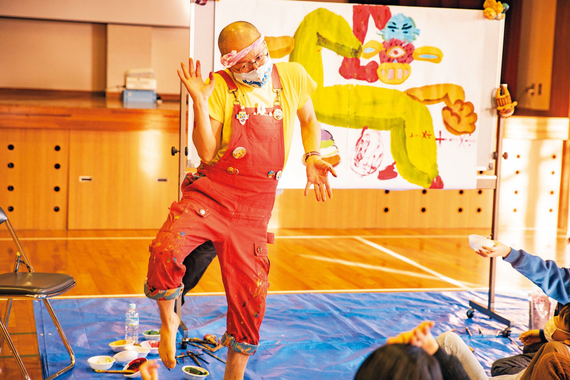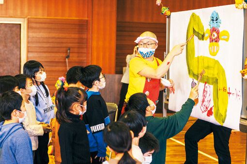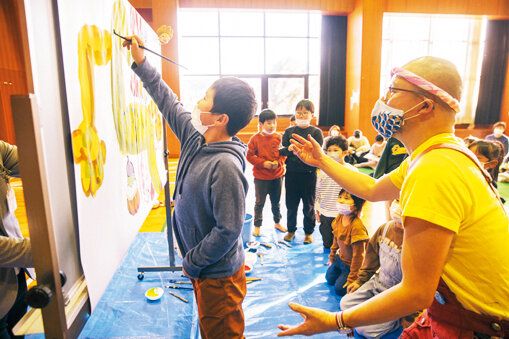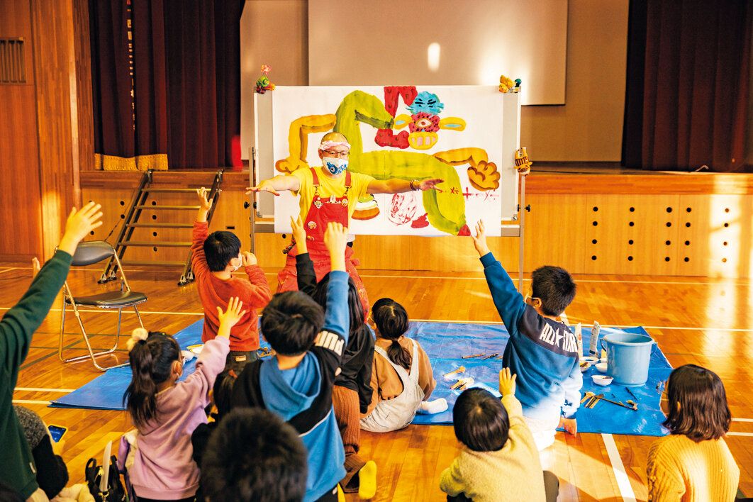 手を挙げた子を順ぐりに指名し、絵筆を渡して自由に描かせる。「子どもたちとは仕事のような利害関係がないので、互いの直感や感性を純粋にキャッチボールし、年齢を超えた遊びができます。僕が驚くような感性を見せつけられて「スゲエ!」となることも多々あって、めちゃくちゃ面白いんですよね」