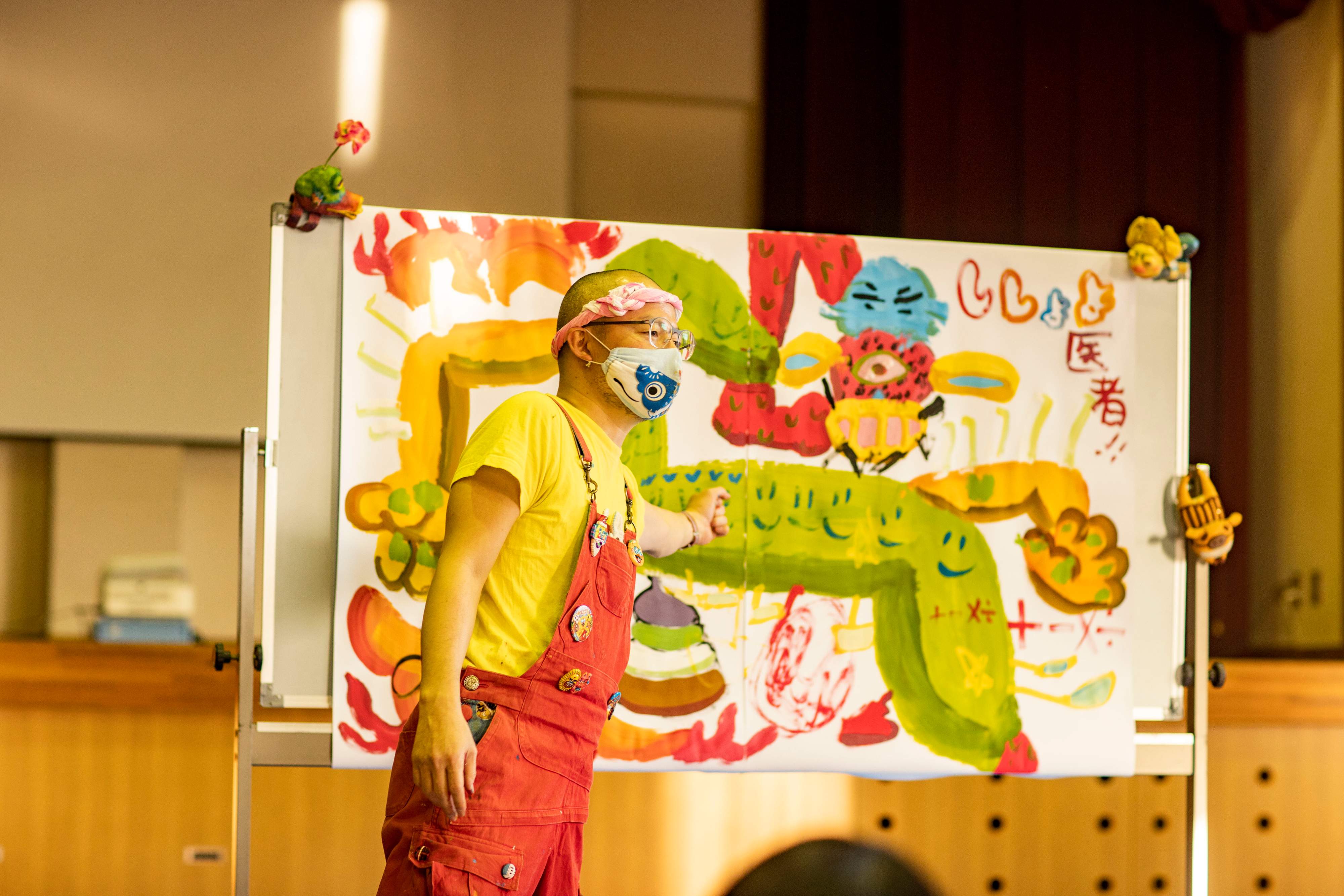 子どもたちの好きなものを次々と合体させた生命体の総称は「おえらさん」。イベント会場の数だけ生まれるおえらさんは、絵筆を握った子どもたちとこうたくさんの合作。「参加してくれた子どもたちに、表現することの面白さが少しでも伝わればと思ってライブをやっとります」