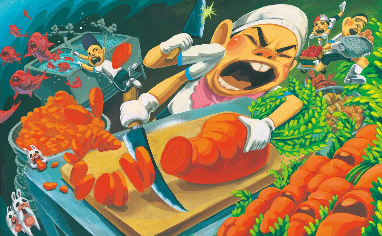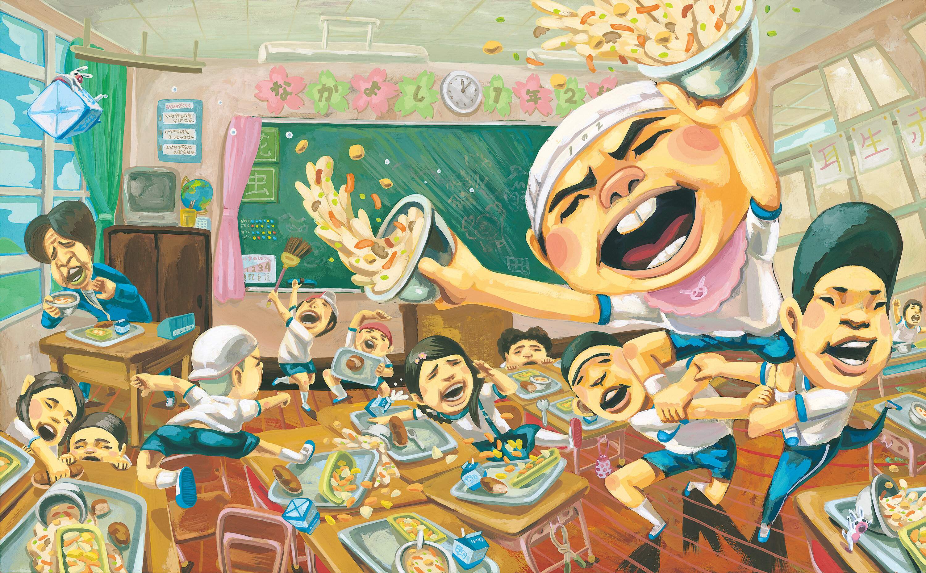 「給食番長」の原画。画面を飛び出すように大胆な構図とビビッドな色使いに並び、すべてのページにストーリーとは関係のない小動物や不思議な生き物が描かれているのも特徴