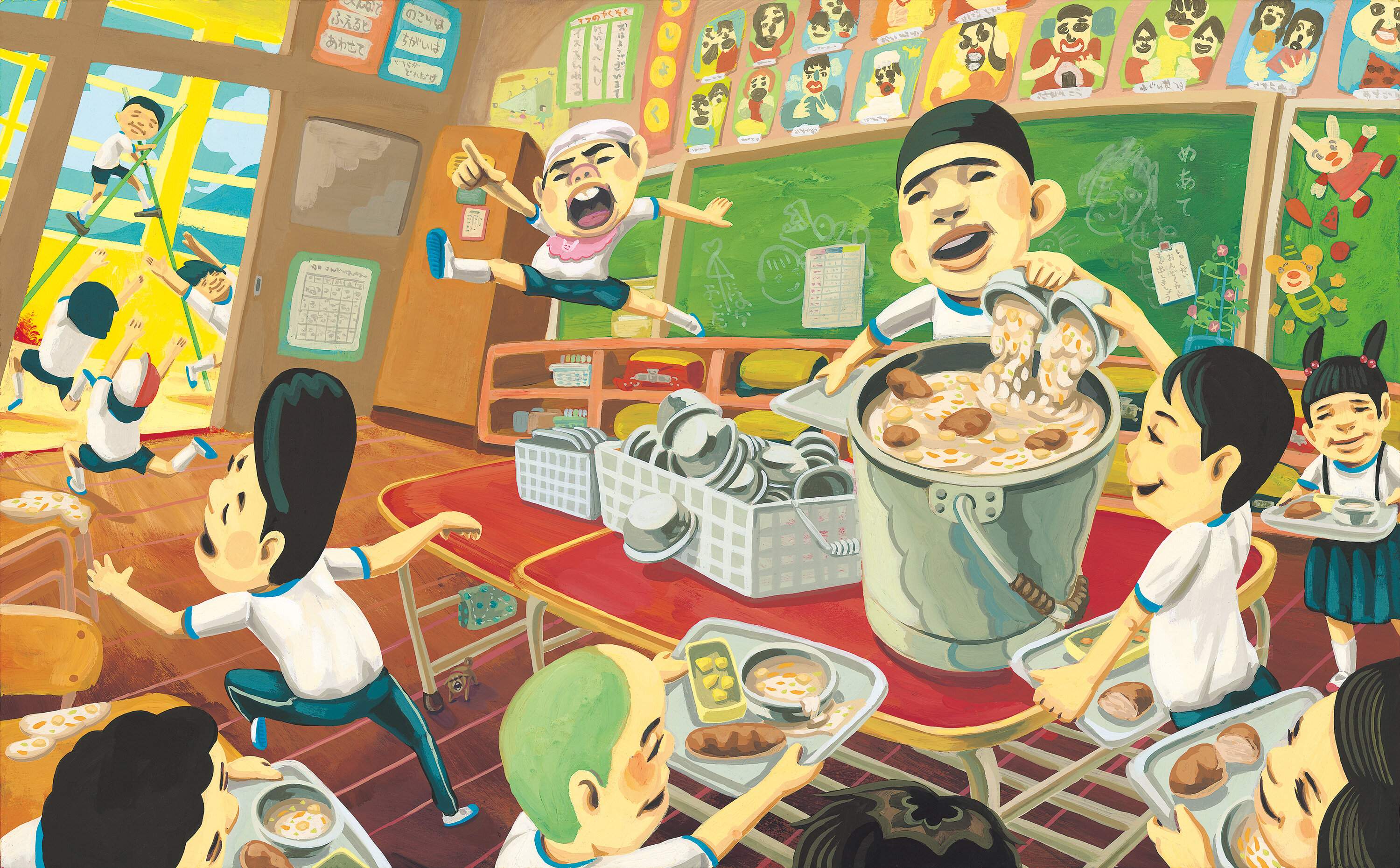 上と同じく「給食番長」の原画。執筆にあたりこうたくさんは、近所の小学校を取材。教室に廊下、調理室の様子や、机、食器、食缶など学校の備品のリアルな描写も見どころの1つ