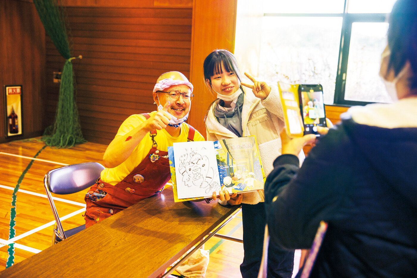 ピースしている女の子は高校生。子どものときから大切に持っているという『給食番長』に渾身のサイン
