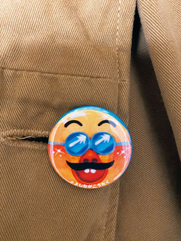会場にいる子どもと大人全員に、自腹でつくったバッジを毎回プレゼントする。絵はこうたくさんの自画像