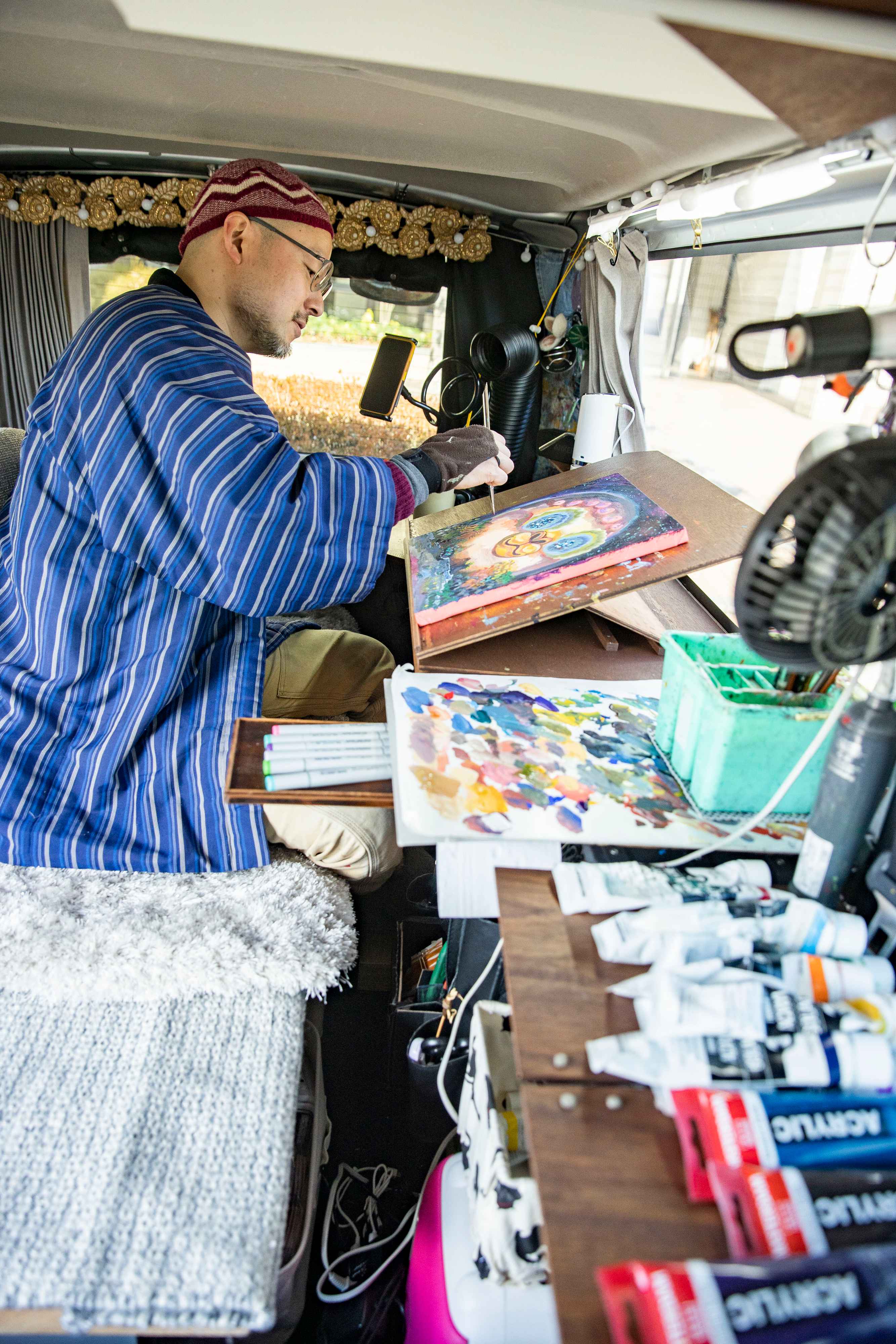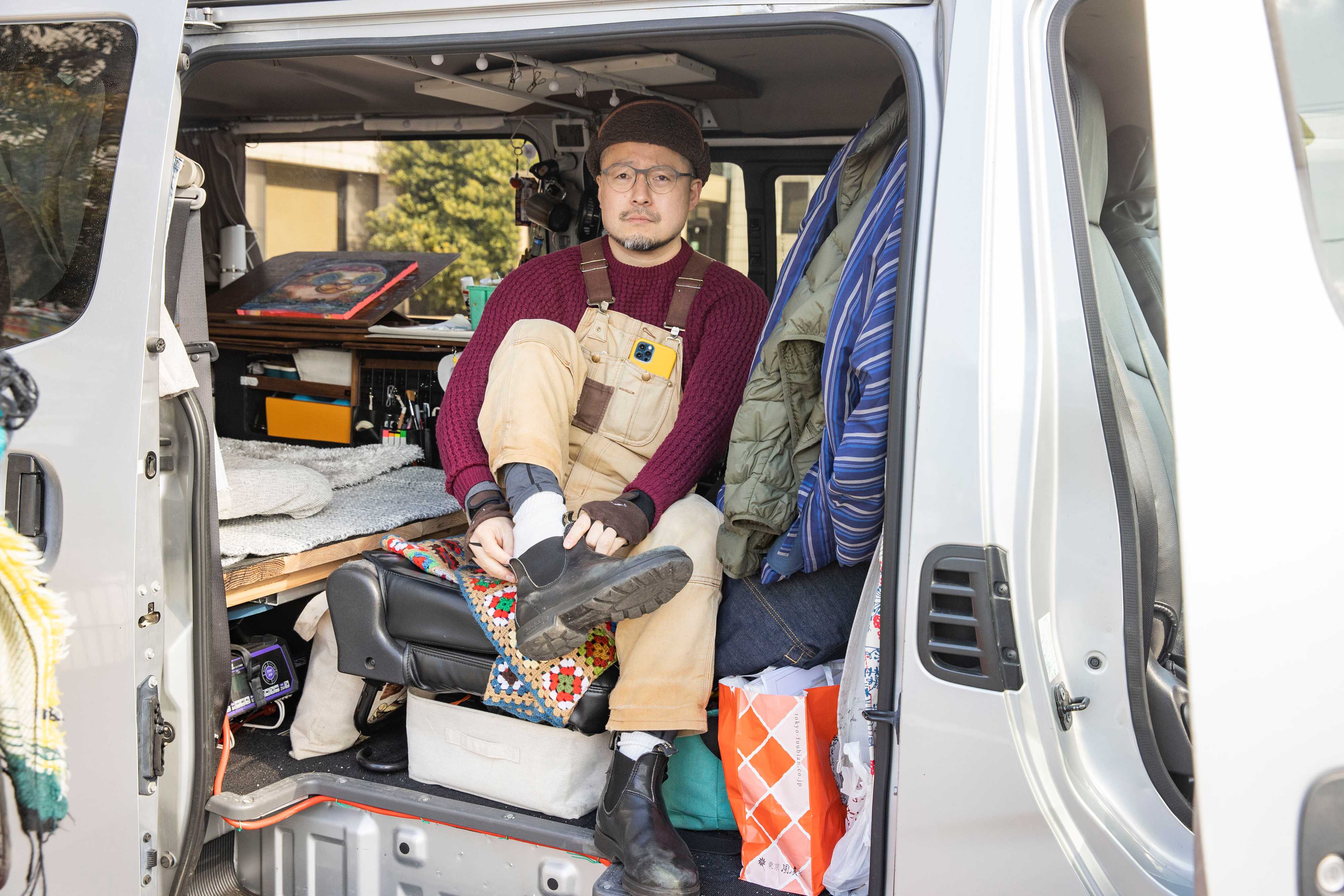 イベント会場へは基本、車移動。このときは福岡市内から香川まで約686キロを1泊2日かけて運転した。車はアトリエ兼車中泊仕様に改造した、その名も「お絵描き号」。移動の合間には車内で、画廊に出品するアクリル画を描く。右手の甲につけているのは「手甲(てっこう)」。手の甲が冷えて絵筆の動きが鈍くなるのを防ぐための必需品