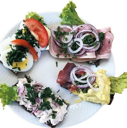 デンマーク伝統料理「スメアブロ(直訳するとバターつきのパン)」は、黒パンに具材を彩りよく盛りつけたオープンサンドイッチ。夫も自分で作って職場に毎日持参。