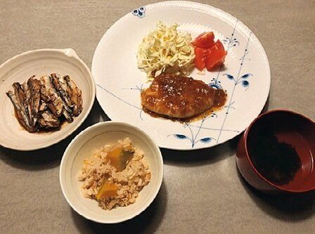 餃子やお好み焼き、カレーライスなどの日本食も子どもたちに大人気。この日は豚肉の生姜焼きとイワシの甘露煮の献立。