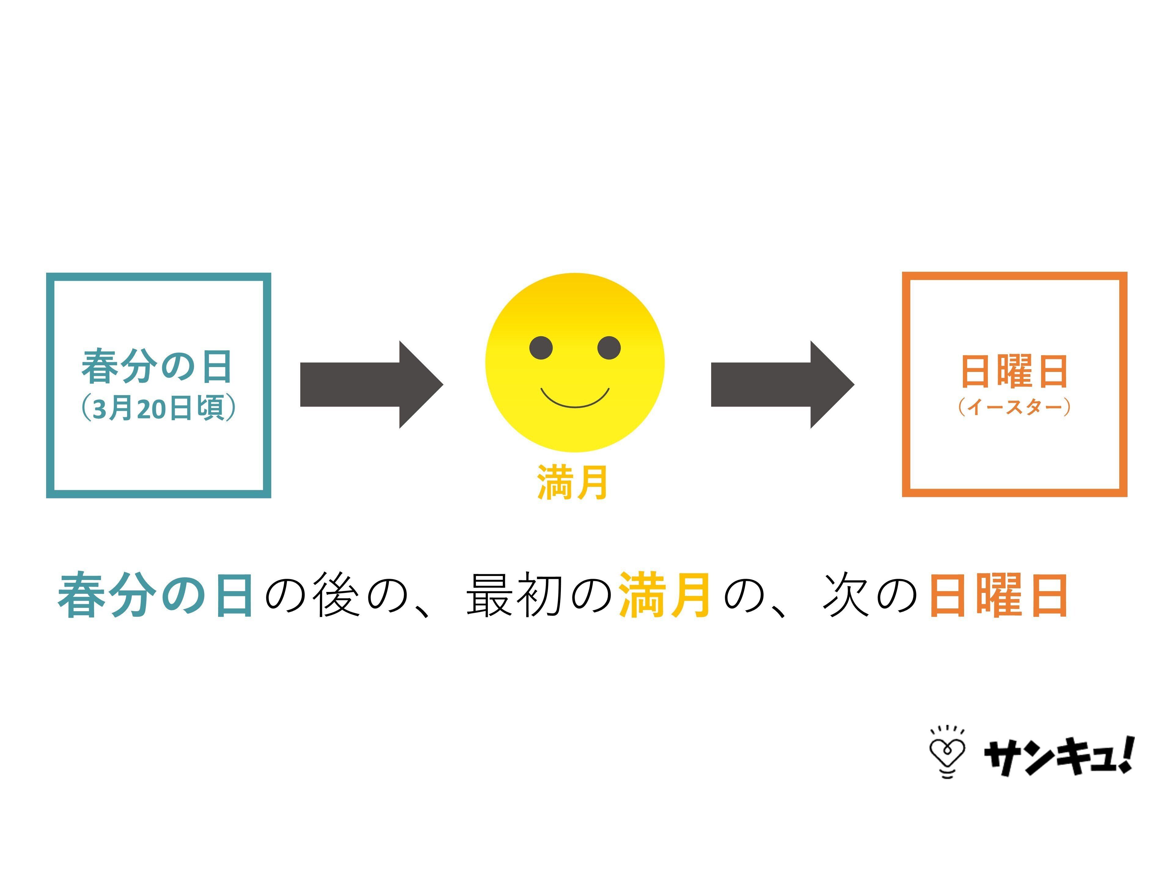 イースターは「春分の日の後の最初の満月の次の日曜日(イースター・サンデー)」と定められているのです。