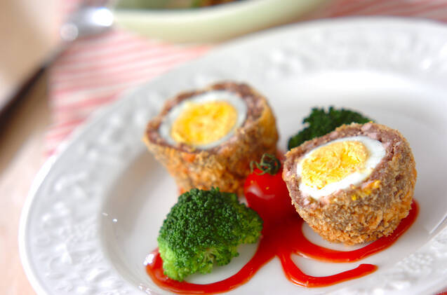 ゆで卵を魚肉ソーセージ入りのあわせだねで包んでフライにした、イースターにぴったりの華やかな一品です。