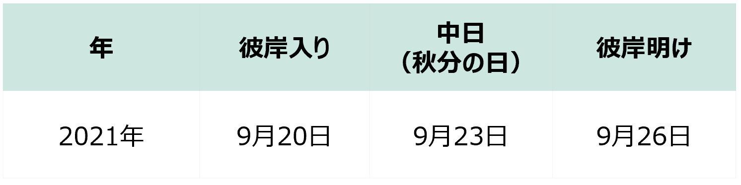 お彼岸の初日の9月20日を彼岸入り、9月23日が中日(秋分の日)、最終日の9月26日を彼岸明けと呼びます。