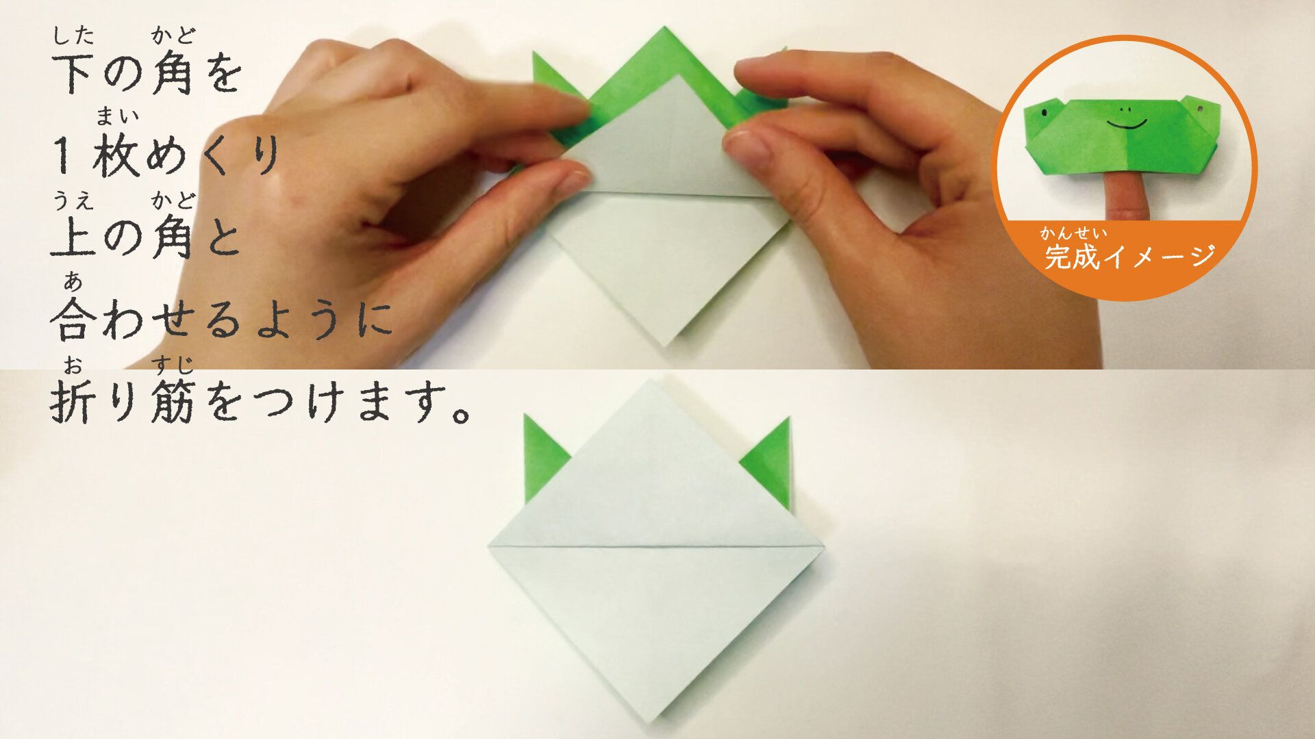 続いて、少し折り方の難易度をあげて、立体的でリアルなぴょんぴょんカエルの作り方をご紹介します。写真の手順に沿って、一緒に折っていきましょう。