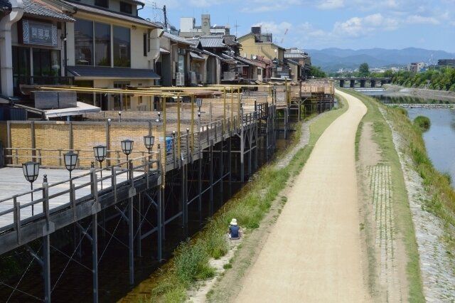 納涼床(のうりょうゆか)は、川を眺めて涼をとりつつ、お食事が楽しめる仮設式の高床のこと。いわゆるテラス席で、京都、大阪の夏の風物詩です。鴨川の納涼床の歴史は古く、桃山時代にまでさかのぼると伝えられています。