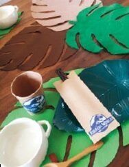 「ドリアは火山噴火、サラダの卵は恐竜の卵、チューリップ形から揚げは恐竜のお肉をイメージしました」。ランチョンマットは100均のフェルトを葉っぱ形にカット。