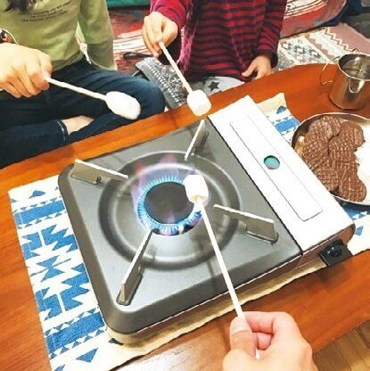 キャンプ漫画『ゆるキャン』に出てくるお手軽スイーツ「スモア」に、子どもとチャレンジ。卓上コンロで焼いたマシュマロをチョコビスケットではさめば、でき上がり!